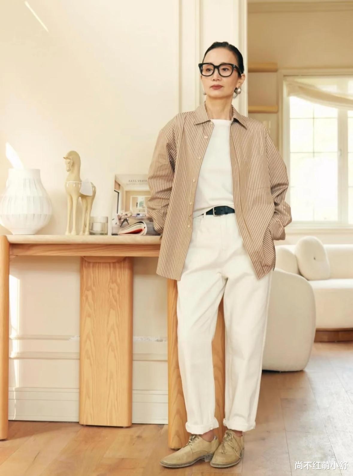 穿搭示范:三木妈妈用白色上衣+白色牛仔裤,外搭浅驼色衬衫,只是巧妙采用墨镜和黑色腰带点缀,然后把裤脚卷起来5厘米小腿,这样的同色系打扮,既然休闲又实用。