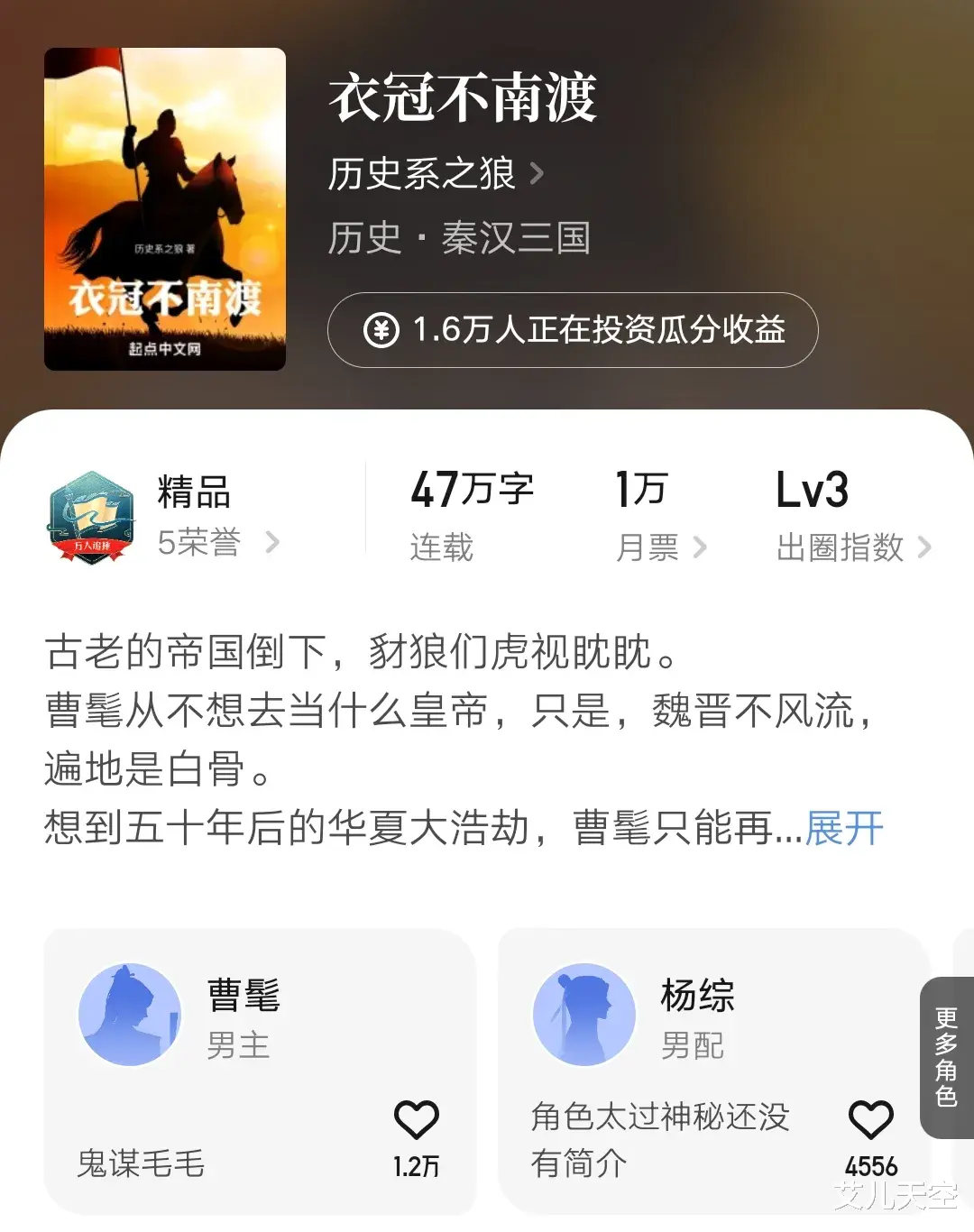 尤其是化身社牛达人,跟谁都能混熟,又善于创造机会,死中求生。不过不得不说这个后三国时代,读者的代入感是要差不少的。历史系之狼的文言文翻译风看多了也有点劝退,当然这本身也是其特色之一,已经经过上本小说的市场检验了。