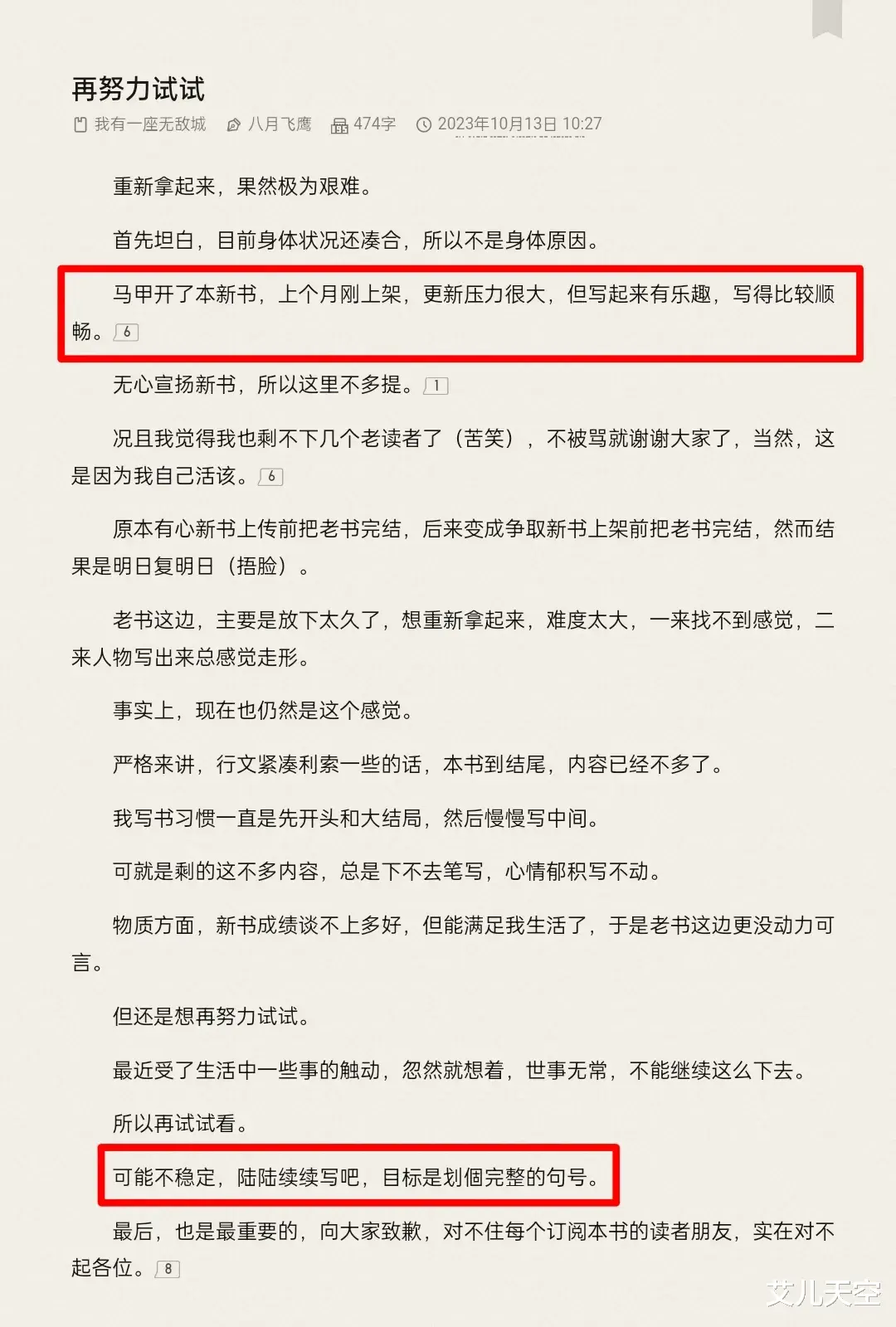 八月飞鹰今天突然更新了一下断更近八个月的老书《我有一座无敌城》,之后还发了一下单章,说后续会努力续上这本小说,不过因为他已经开了马甲新书,成绩还不错,这本老书停更太久,也不容易捡起来,只能尽量写写。