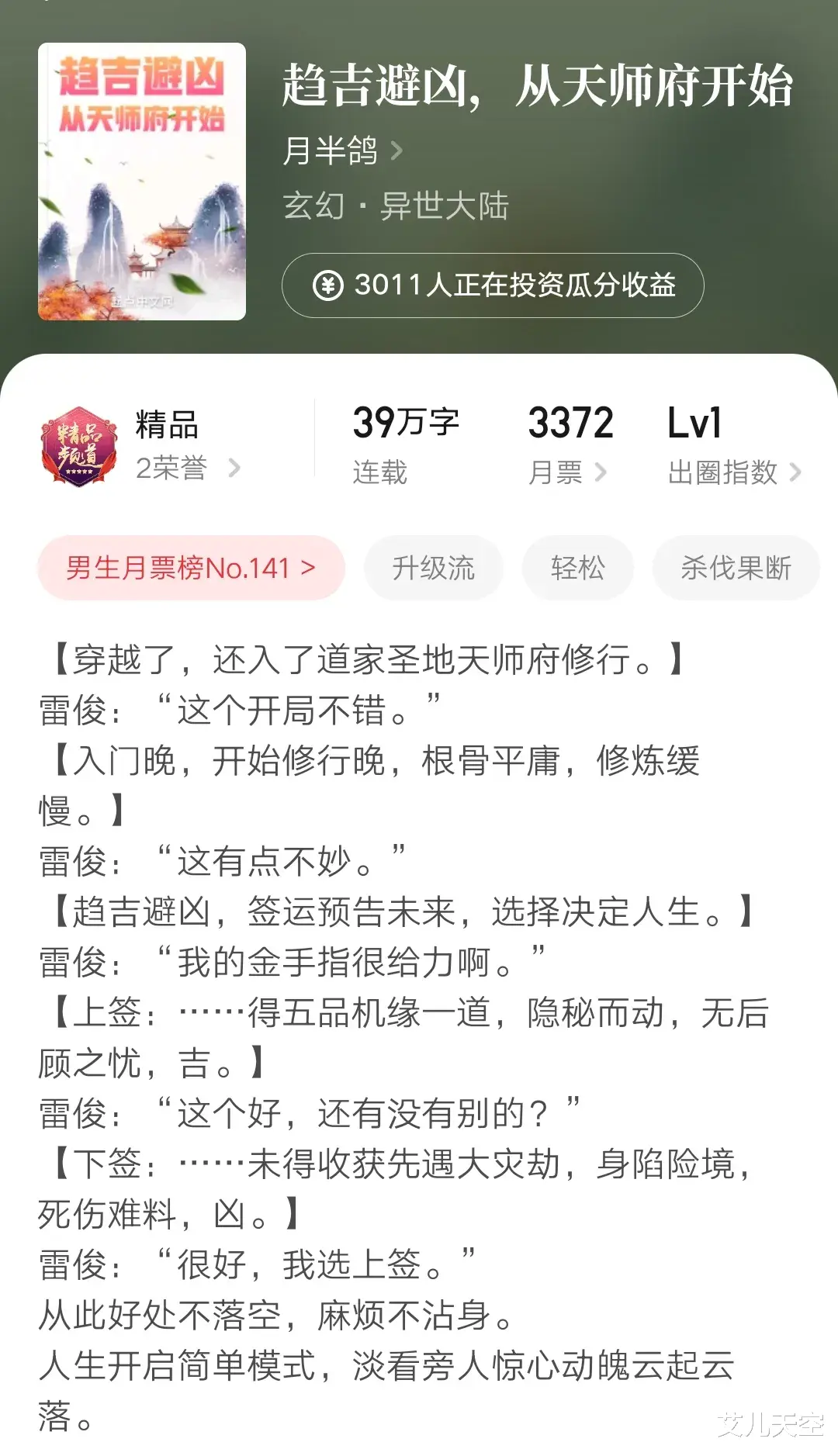 小说我之前看过一点,主角的穿越仙妖并起神魔齐出的修行世界,金手指是可以触发各种签运,签运选择不同完成之后奖励也不一样,主角自然是根据签运提示趋吉避凶,走上了比较顺利的修行之路。有兴趣的可以去试试。