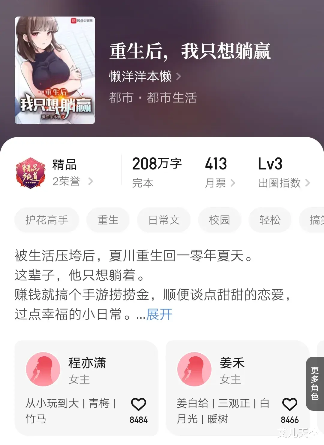 懒洋洋本懒的《重生后,我只想躺赢》已经在今天完结了,小说写了不到十个月,成绩虽然不如上本小说《重生后,被倒追很正常吧》,但也有精品。