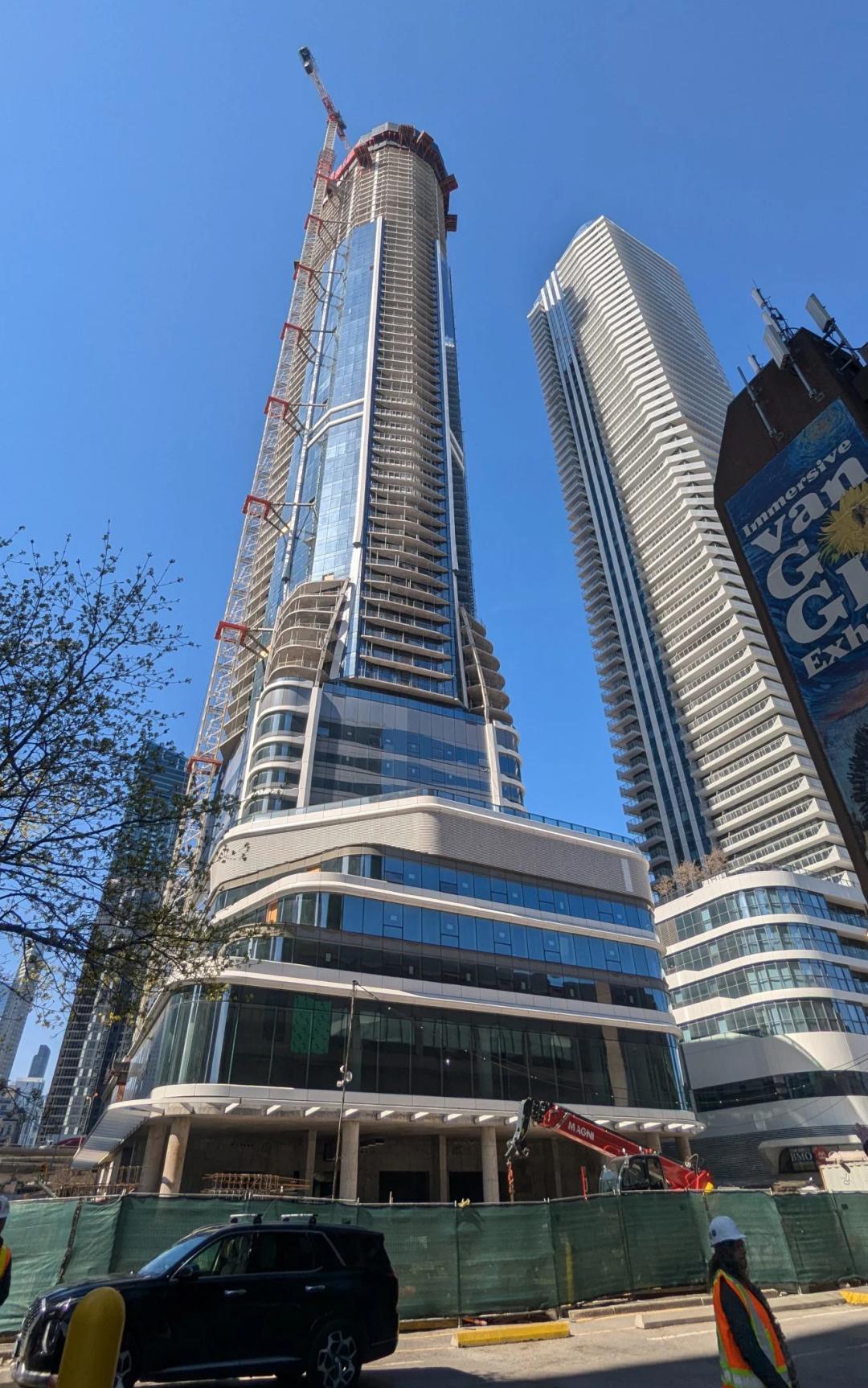 这座楼的建设过程也是一波三折。最早计划是95层、312米,后来为了争“加拿大第一高楼”的名号,反复调整高度,最终定格在106层、351.85米。2020年底开工,到2025年底已经基本达到最终高度,外立面幕墙工程过半,预计2026年整体完工。
