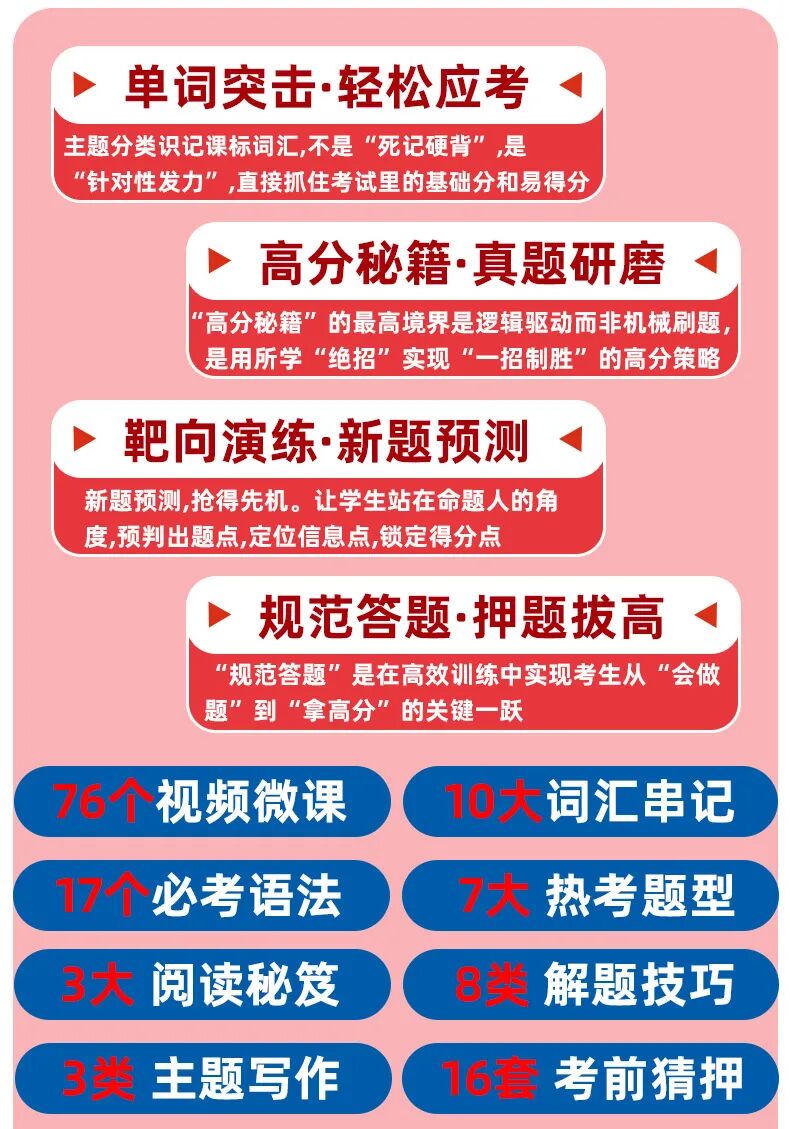 配套资源全,碎片化复习高效。扫码可看免费名师微课堂,适配碎片时间;轻薄便携,杂志化排版,告别低效啃大书;套装购买享8折优惠,加赠真题集和猜押卷,性价比拉满。