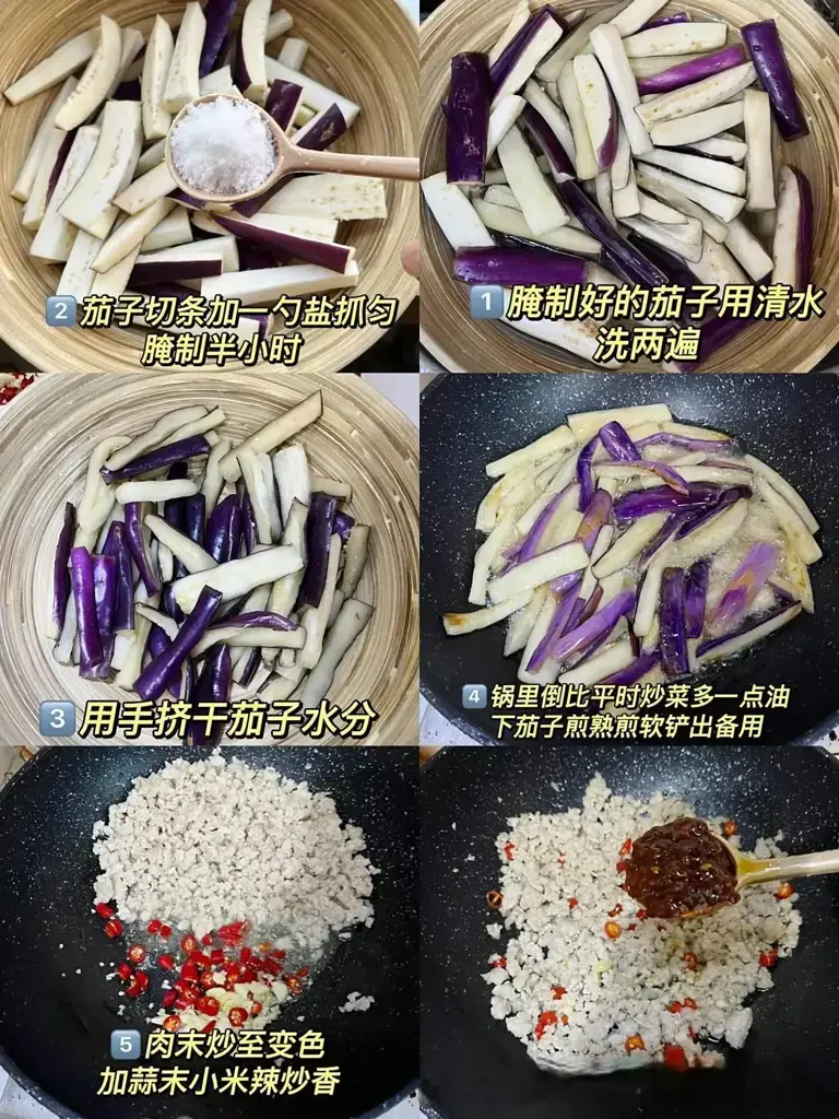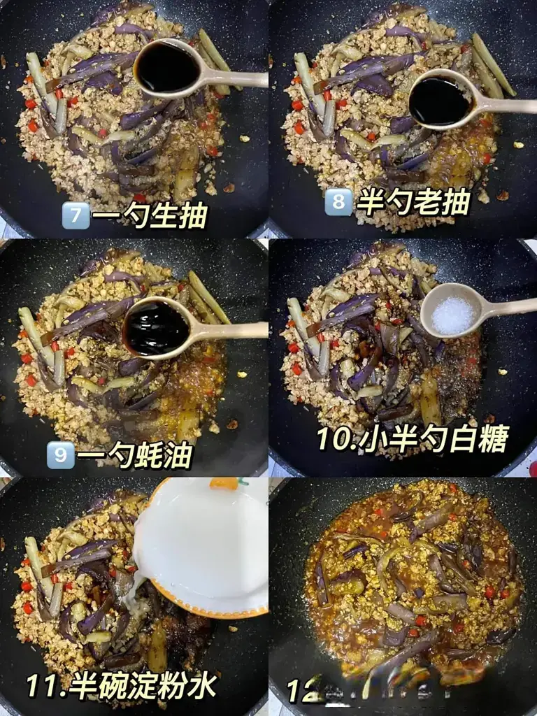 调味融合:当茄子炒至软烂时,将之前炒好的肉末重新倒入锅中,加入生抽、老抽(如果使用)、白糖调味,继续翻炒均匀。此时可根据个人口味调整盐量,保持咸淡适中。
