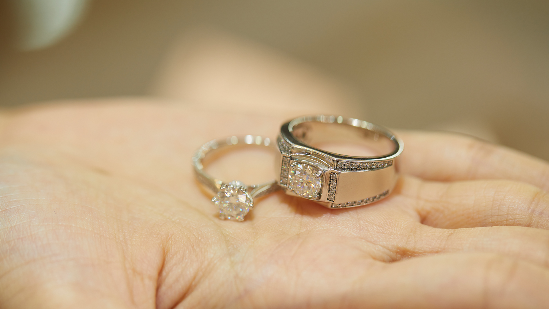 男女款设计元素一致(比如同样的素圈、同样的碎钻排列),仅在尺寸和宽度上有差异(男款戒圈宽 6-8 毫米,女款宽 2-4 毫米);