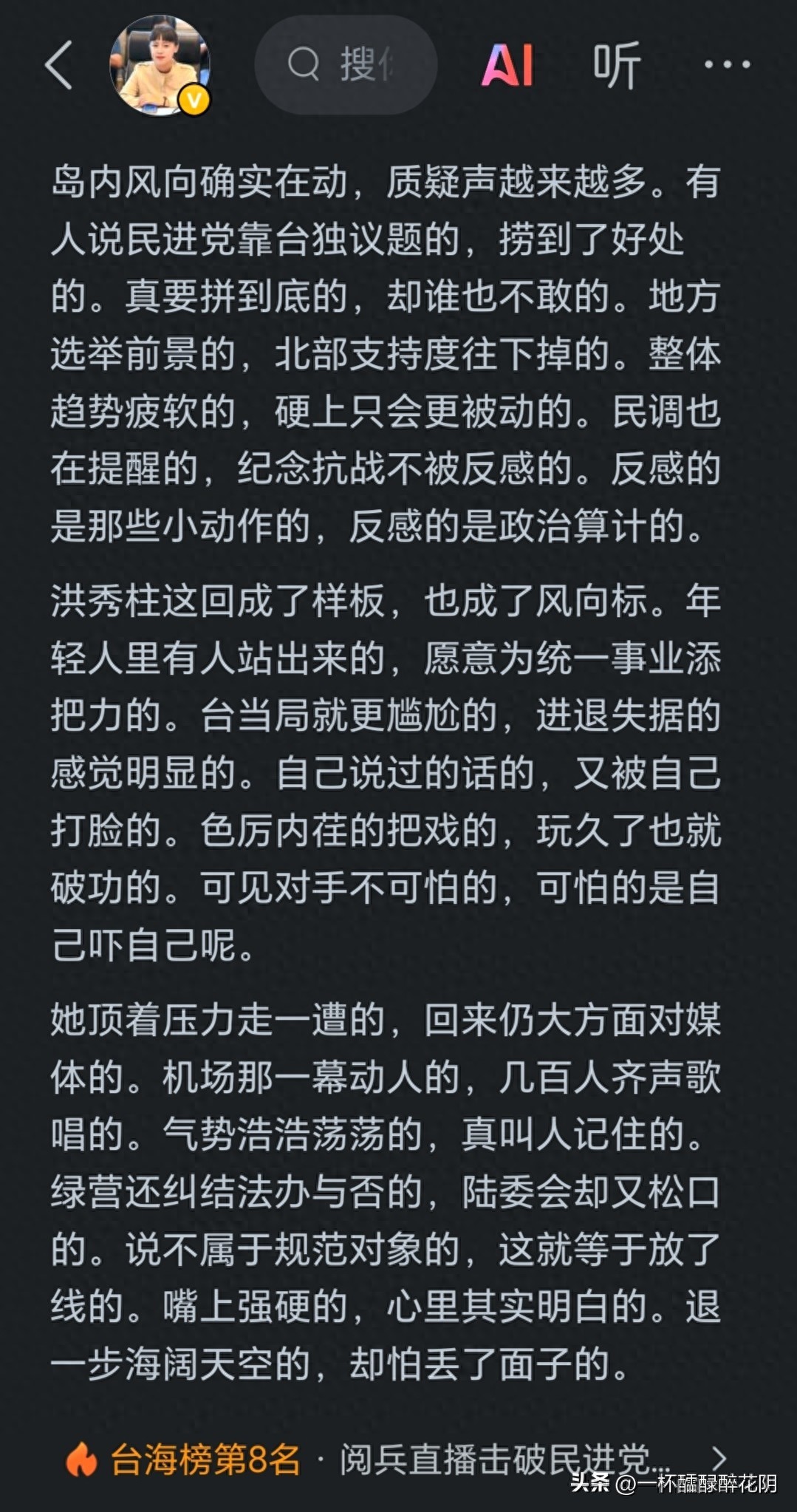 当选择口语化风格时,更需展现“化繁为简”的功力。用通俗的语言讲清复杂的道理,用规范的文法保证表达的流畅。比如同样讨论两岸议题,规范的口语化表达可写“洪秀柱赴陆参加阅兵,不仅打破了台当局的舆论垄断,更让岛内民众看到了两岸交流的另一种可能”,既直白易懂,又通过“不仅……更……”的关联词理清逻辑;而飞岸的文章中“她一亮相的,气氛就被点着了”“握手三十多秒的,细节被台媒反复解读的”,则用冗余助词破坏了句子的语法完整性,让本应清晰的逻辑变得模糊。这种“想口语化却失了文法”的情况,本质是缺乏“文字打磨意识”。即便追求轻松的风格,也需对“的”字的使用、分句的衔接、语气词的取舍做基础优化,这不是“吹毛求疵”,而是文字工作者的基本素养。
