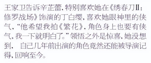 辛芷蕾和杨幂缘分不浅,当年杨幂作为二番女主出演《绣春刀II》,最后出圈让观众记住的是辛芷蕾的“刀”,随后辛芷蕾凭借这一片段获得王家卫青睐出演《繁花》。