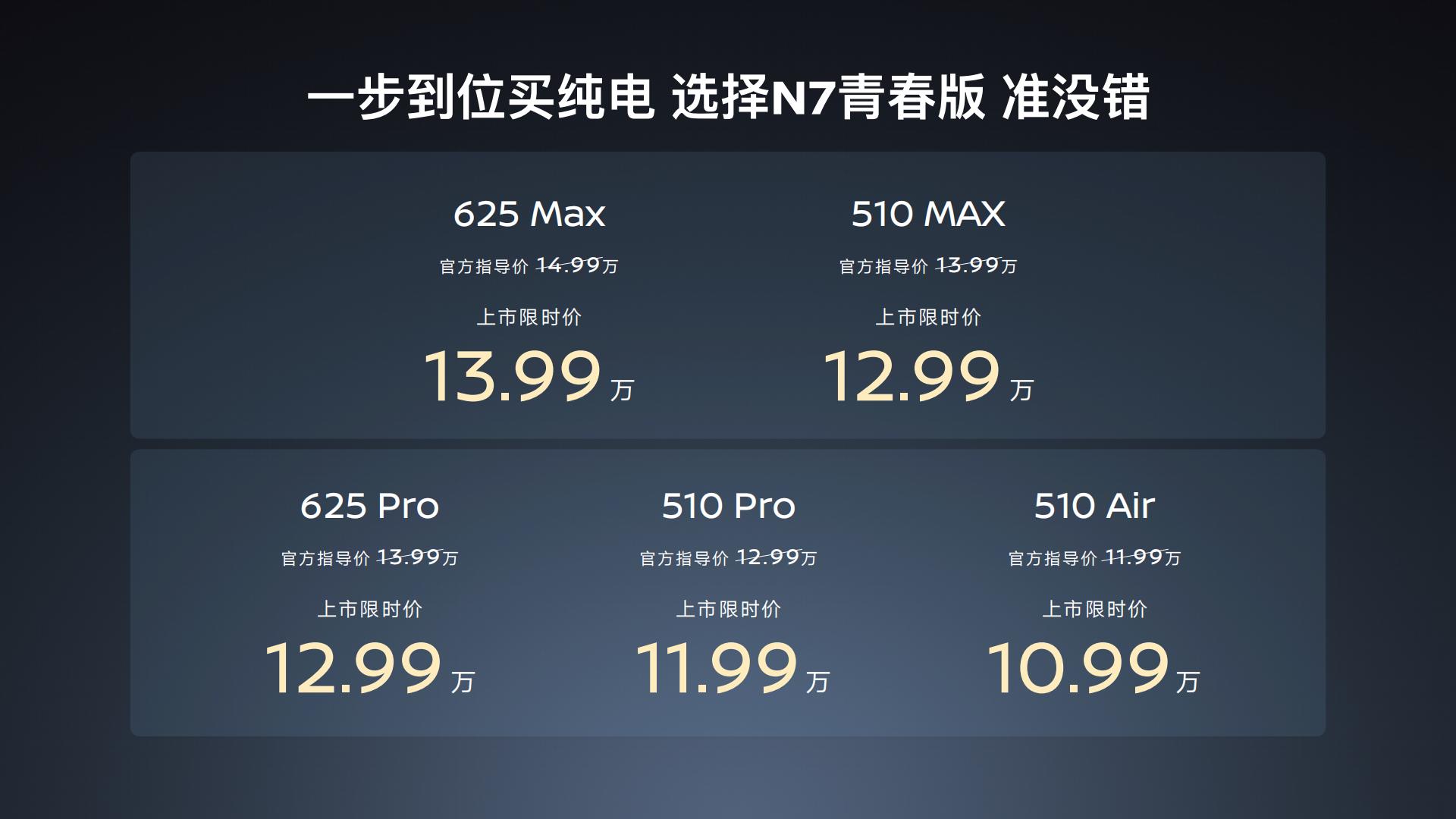 竞品优势: 相比同价位纯电车型,N7青春版在空间尺寸、底盘质感(防晕车)以及智驾硬件(8295芯片+端到端智驾)上均表现出越级水准。其用户净推荐值在中大型纯电轿车中排名第一,口碑优势明显。上市限时价10.99万元—13.99万元。