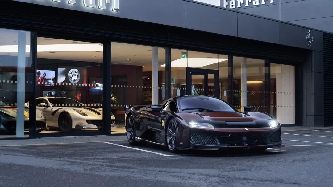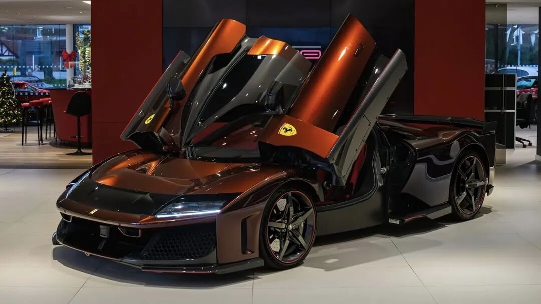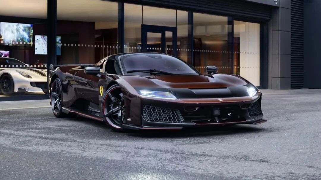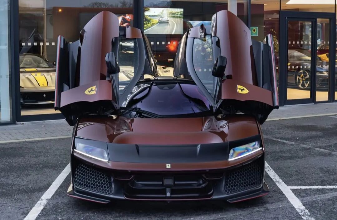 这台法拉利F80采用Rosso Taormina红色涂装,搭配红色点缀以及带红色细节的碳纤维轮毂。车身外部也可见大量碳纤维材质。前分离器、侧裙以及后翼子板均为裸露碳纤维。外后视镜盖和车顶似乎也采用了碳纤维处理。