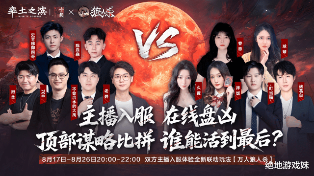 值得一提的是,这次“率土狼人杀”还请来了“叮当猫”、“诸葛白”、“700哥”十二位知名主播落地新服九州,隐藏身份混入九大阵营中,与玩家们一起开启一场前所未有的“抓狼行动”,让这场“万人狼人杀”大战更有看点!