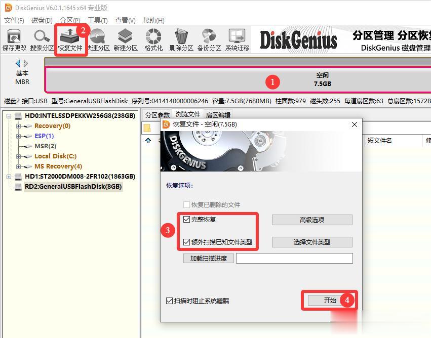 步骤1.选中这个U盘,点击“恢复文件”,选择“完整恢复”,然后点击“开始”。