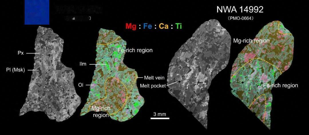年轻的月海玄武岩是研究月球晚期火山活动的关键对象,科学界一般认为,自月球形成以来,其内部的玄武岩岩浆活动以简单结晶为主,缺乏类似地球岩浆房常见的动态过程。研究团队利用扫描电镜、电子探针等分析技术,对两块发现于2021年的月球陨石NWA 14526和NWA 14992开展了详细研究。