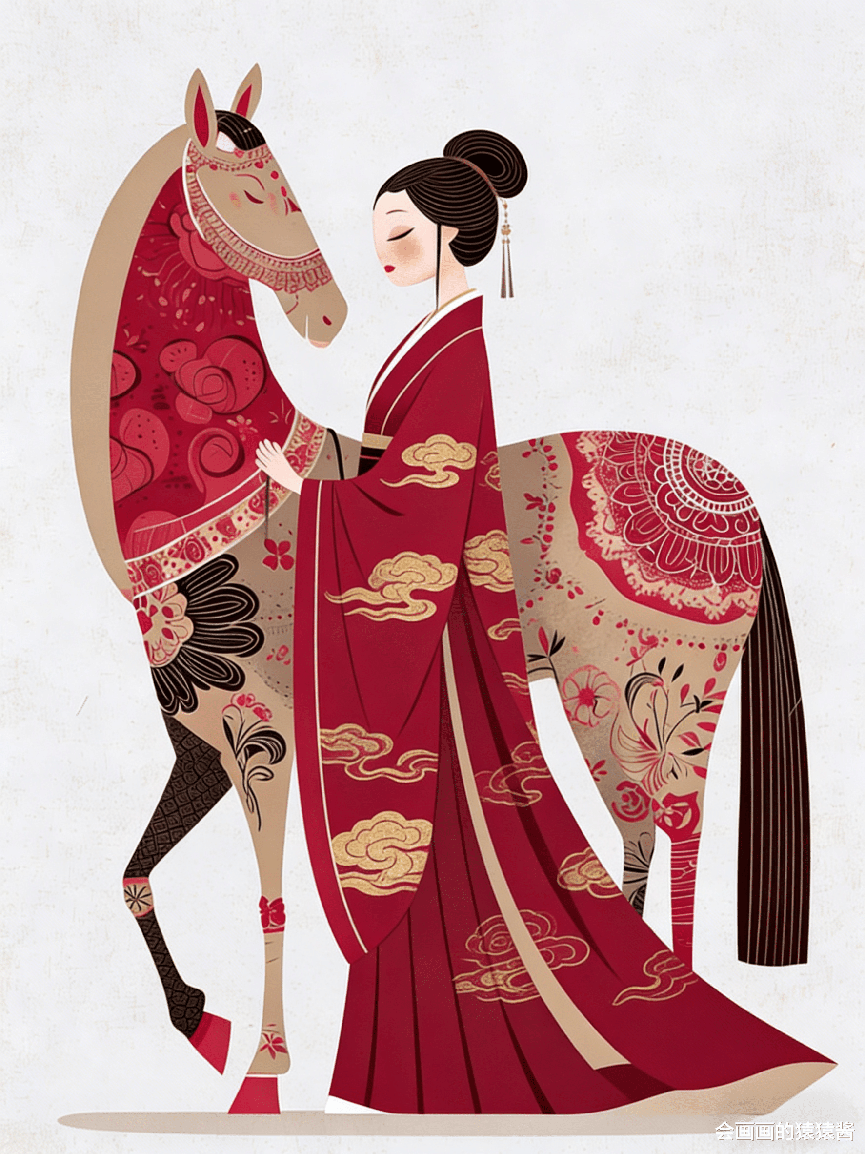 竖版构图,国风剪纸风插画,汉服少女(红底金纹汉服+黑长卷发),红金缠枝花卉纹样骏马,朱红宫墙背景,悬挂的红色灯笼,剪纸利落线条,平涂红金主调,传统花卉纹样,高清8K,国风插画风格,新春喜庆氛围感拉满。