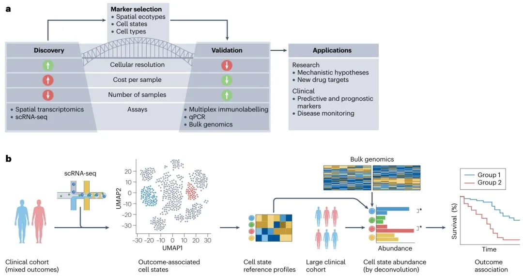 通过数字 cytometry 等解卷积方法,将单细胞与空间转录组学发现转化为临床可用的生物标志物,助力疾病分类、治疗指导与预后评估。