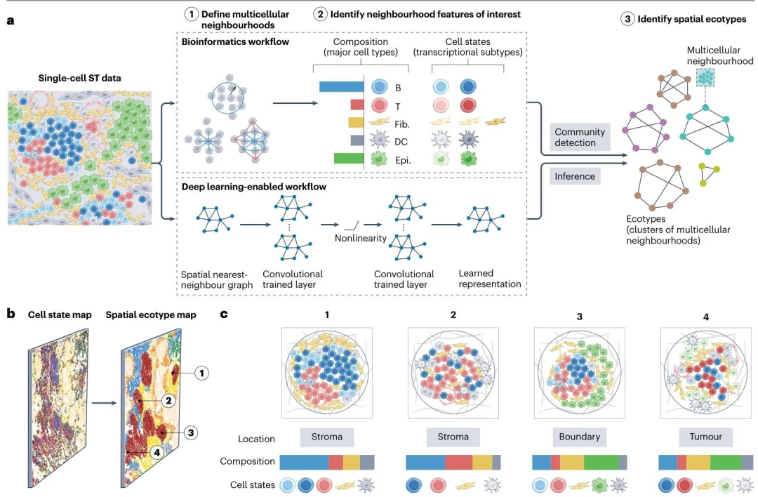 技术平台涵盖探针基方法(Vizgen MERSCOPE、seqFISH+)的亚细胞分辨率优势、全转录组覆盖方法(10x Genomics Visium、Slide-seq V2)的空间 - 转录组平衡,以及空间条形码结合单细胞测序方法(XYZeq、Slide-Tags)的高捕获效率特点;计算工具通过解卷积(Cell2Location、RCTD)、基因表达填补(BayesSpace、XFuse)、多样本对齐技术突破分辨率与覆盖度限制;提出 “空间生态型” 概念,通过固定半径、K 近邻或 Delaunay 三角剖分定义多细胞邻里,结合细胞组成、基因表达特征及深度学习模型(GraphST、SpaceFlow),揭示肿瘤 - 基质界面、淋巴样结构等 recurrent 空间组织模式。