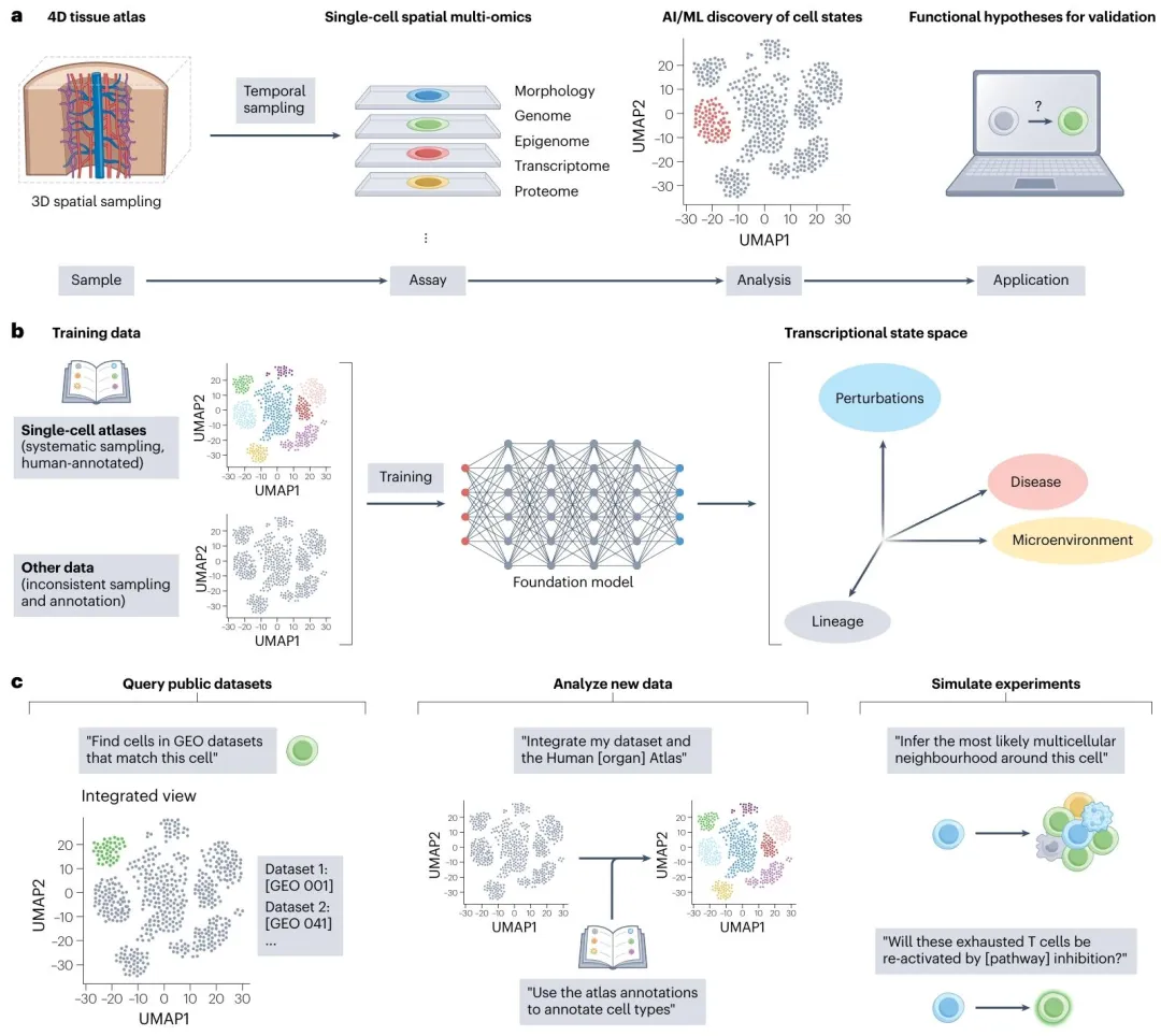 该综述全面梳理了单细胞与空间转录组学的技术演进与核心突破,其核心价值在于构建了 “技术 - 分析 - 应用” 的完整框架:一方面点明了样本处理标准化、数据整合准确性等关键技术痛点的解决方案;另一方面强调了 “空间生态型”“多细胞邻里” 等创新概念对解析组织微环境的重要意义。尤为前沿的是,文中突出了基础模型在整合高维、异质性数据中的核心作用,为跨物种、跨组织的细胞图谱构建提供了新路径。未来,随着技术标准化推进与 AI 工具的深度融合,单细胞与空间转录组学将在精准医学、再生医学等领域实现更广泛的临床转化,为疾病机制研究与治疗靶点发现开辟新赛道。