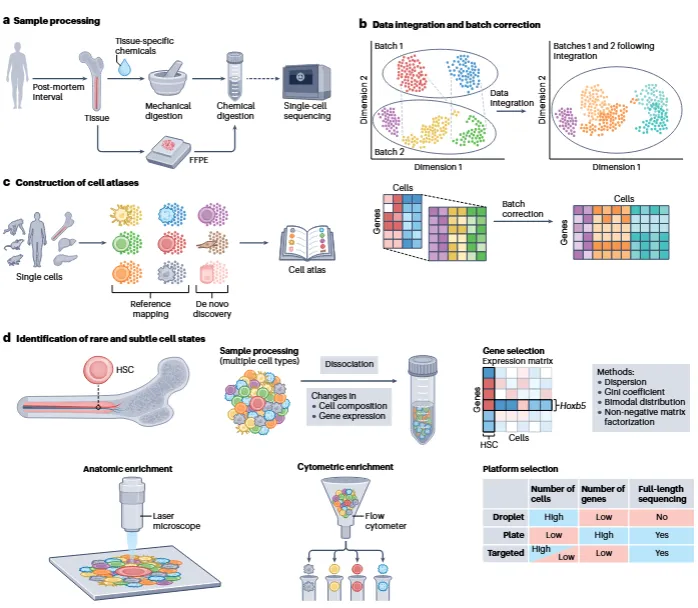 聚焦样本处理中的技术偏差控制,包括死亡后组织转录组变化、消化酶类型与温度对细胞组成的影响,以及 snRNA-seq、化学固定等优化方案的优势与局限;数据整合与批次校正方面,对比线性模型(ComBat、limma)、非线性方法(fastMNN、Harmony)及神经网络模型(scVI、scANVI)的适用场景,强调 “对照池设计” 在减少混杂因素中的作用;稀有和微妙细胞状态识别需结合靶向富集策略(如细胞表面标志物筛选)、全长测序技术(MAS-seq、VASA-seq)及特色工具(RaceID3、GiniClust3),同时通过统计方法降低假阳性风险。