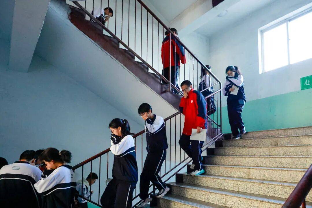 这次演练既是教体局的要求,也是该校每学期进行的必练项目。10点20分,消防演练的警报声响起,同学们用湿毛巾或袖口捂着鼻、猫着腰,按照既定疏散路线分批次从教学楼前后门和侧门快速有序跑出,仅用3分51秒就全部到达梧桐广场集合地。