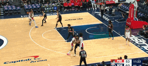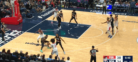 右侧的zoom(掩护+手递手)发起,萨尔手递手助攻乔治命中三分: