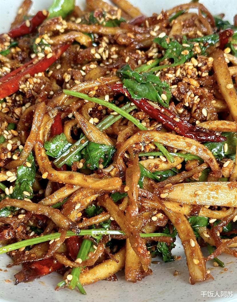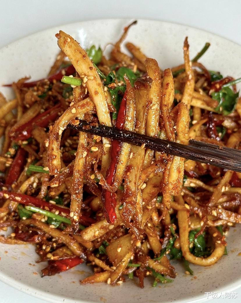 接下来就是煸炒的环节,这是决定成品是否香酥的关键。起锅烧油,油量可以比平时炒菜稍微多一点点,油热后倒入挤干水分的杏鲍菇条。此时需要用中小火耐心地煸炒,不要急着放调料。在煸炒的过程中,你会看到杏鲍菇内部残留的水分进一步被逼出,表面开始变得微微焦黄,边缘出现一点点焦褐感。当杏鲍菇炒至金黄且体积明显缩小时,说明火候已经到了,将其盛出备用。这一步的“干煸”是这道菜好吃的核心,只有把蘑菇里的水汽炒干,它才能像海绵一样吸收后面的酱汁和香料。