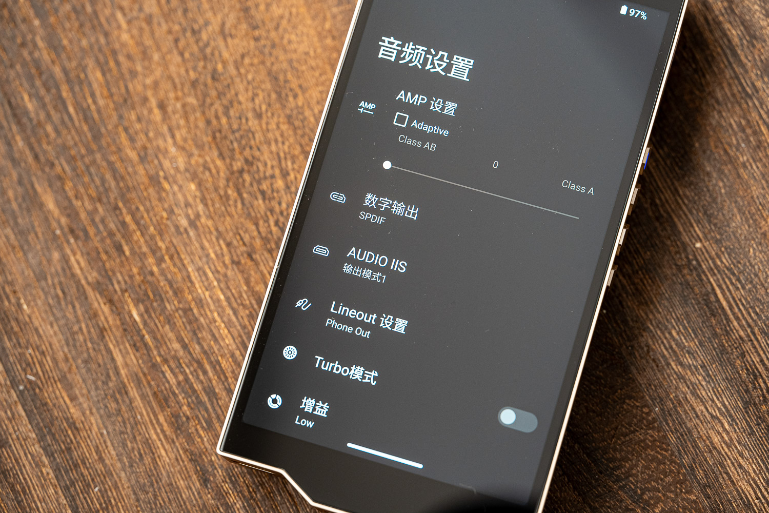 Adaptive AMP,说实话这个东西可太tm牛逼了,牛逼之处不低于AK在T系列机器上提供的电子管/晶体管Hybird模式,而海贝给它提供了64级调节模式,说白了就是在以往海贝的机器能够切换A/AB类的基础上,你可以选择调整两种放大模式的输出比例,再结合海贝自家的OS/NOS切换、滤波器切换,以及可以提高输出上限的Turbo模式等等,RS8ii在耳机/耳塞的适配性上也是现阶段超旗舰播放器里最好的那一台。