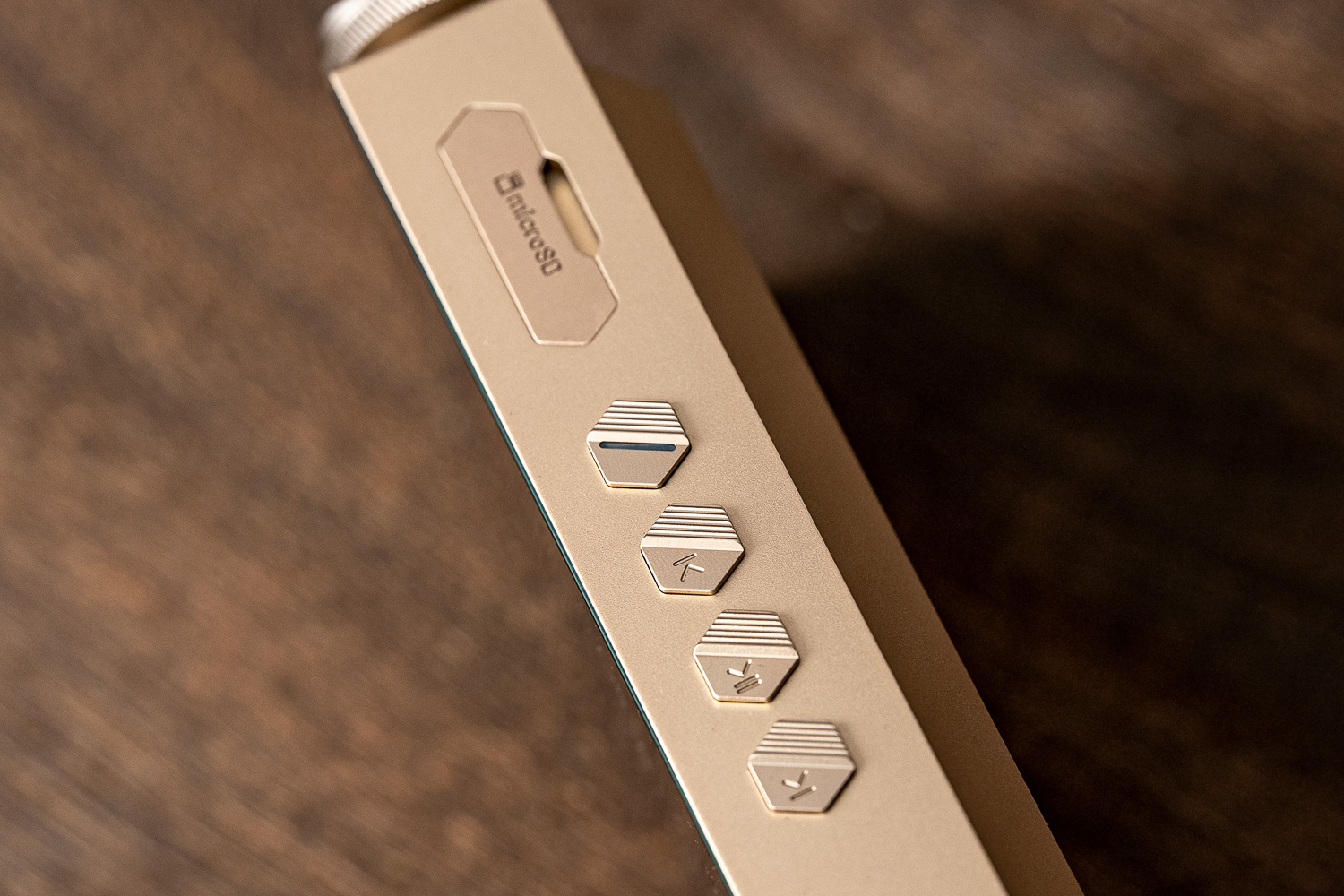 我很喜欢RS8ii的外观,外壳虽然摒弃了RS8上的钛合金与黄铜复合材质,而改为了可能更“好用”的铝合金,但最核心的还是海贝这次在设计上的用心,皇冠造型的电位器、具备折面纹理的按钮、蜂窝纹与拉丝拼接的背板,整个RS8ii身上无不充斥着科技与几何之美,可能是海贝自己所能掌握的供应链环节里最极致的一次外观打磨,尤其是建立在SP4K这一代做工退步了的前提下,RS8ii的美显得更为的纯粹与可贵。