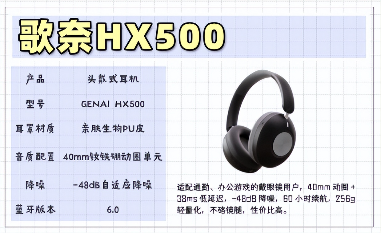 歌奈HX500这款耳机适合谁?适合需要超长续航、兼顾办公游戏的通勤族,尤其是戴眼镜的用户,它能完美解决耳罩硌镜腿的痛点。