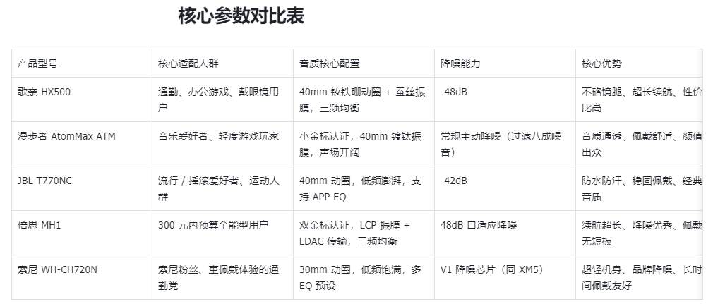 对于大多数普通消费者来说,预算有限但又不想在音质和舒适度上妥协,选耳机成了件头疼事。毕竟市面上同价位的耳机鱼龙混杂,有的主打音质却夹耳压耳,有的戴着舒服但音质像听收音机,想找到二者兼顾的产品并不容易。这次我特意挑选了五款呼声最高的热门机型——歌奈HX500、漫步者AtomMax ATM、JBL T770NC、倍思MH1、索尼WH-CH720N,专门围绕大家最关心的音质表现和佩戴舒适度这两个核心点做深度测评,同时也会兼顾续航、连接稳定性等实用细节,帮你在500元预算里找到真正的“无短板”耳机。
