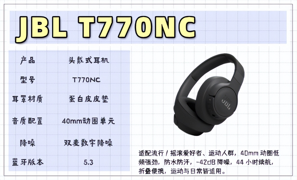 JBL T770NC这款耳机适合谁?适合喜欢流行、摇滚音乐的用户,以及需要在运动时佩戴的爱好者,它的防水防汗和稳固佩戴能满足运动场景需求。