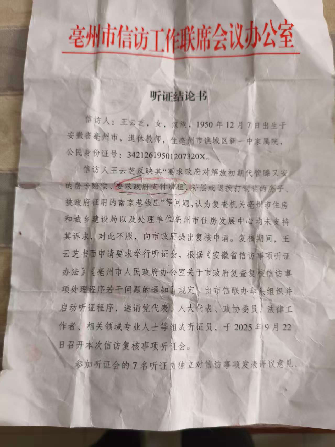 但王女士认为,相关部门针对南京巷钱庄处置的回复,未提供完整法律依据和正规手续,仅以部门会议研究为由便移交管理权限,不符合相关规定,因此对该答复并不满意。此后,她继续向亳州市住建局反映情况,后续由市信联办牵头组织启动听证程序,就南京巷钱庄相关补偿问题进行讨论,但复查机关和处理单位均未支持其诉求。听证复核诉求被驳回基于对复查结果的不认可,王女士市政府提出复核申请,2025年9月22日,由市信联办牵头组织并启动听证程序。听证会上7名听证员独立对信访事项发表评议意见,但最终依据现有法律政策,听证会得出不予支持王女士诉求的结论。