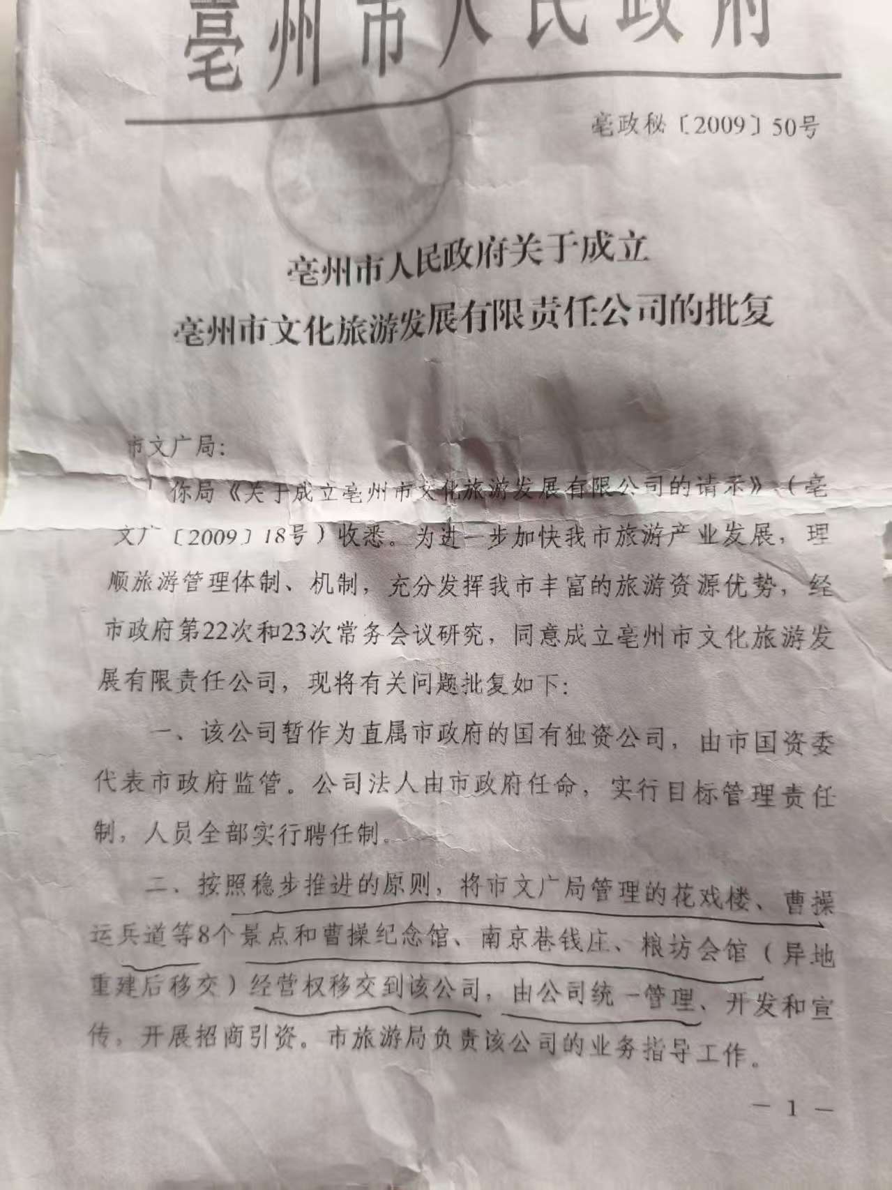2025年5月15亳州市政府给出批复,内容显示:为加快旅游产业发展,理顺旅游管理体制,经市政府常务会议研究,同意成立亳州市文化旅游发展有限责任公司,并将市文广局管理的花戏楼、曹操运兵道等8个景点和曹操纪念馆、南京巷钱庄、粮坊会馆经营权移交到该公司。