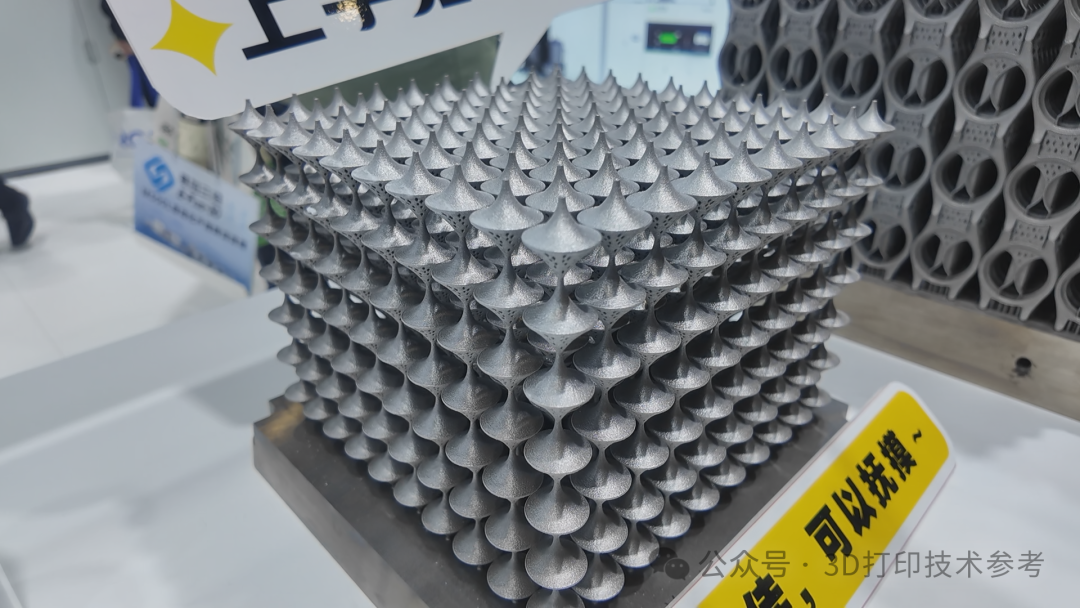 倍丰展示了采用钛合金、大层厚打印的陀螺样件。该产品满版共700件,53小时打印完毕,单件制造时间约为4.5分钟。倍丰指出,大层厚、堆叠、高效,也可以实现高表面质量。
