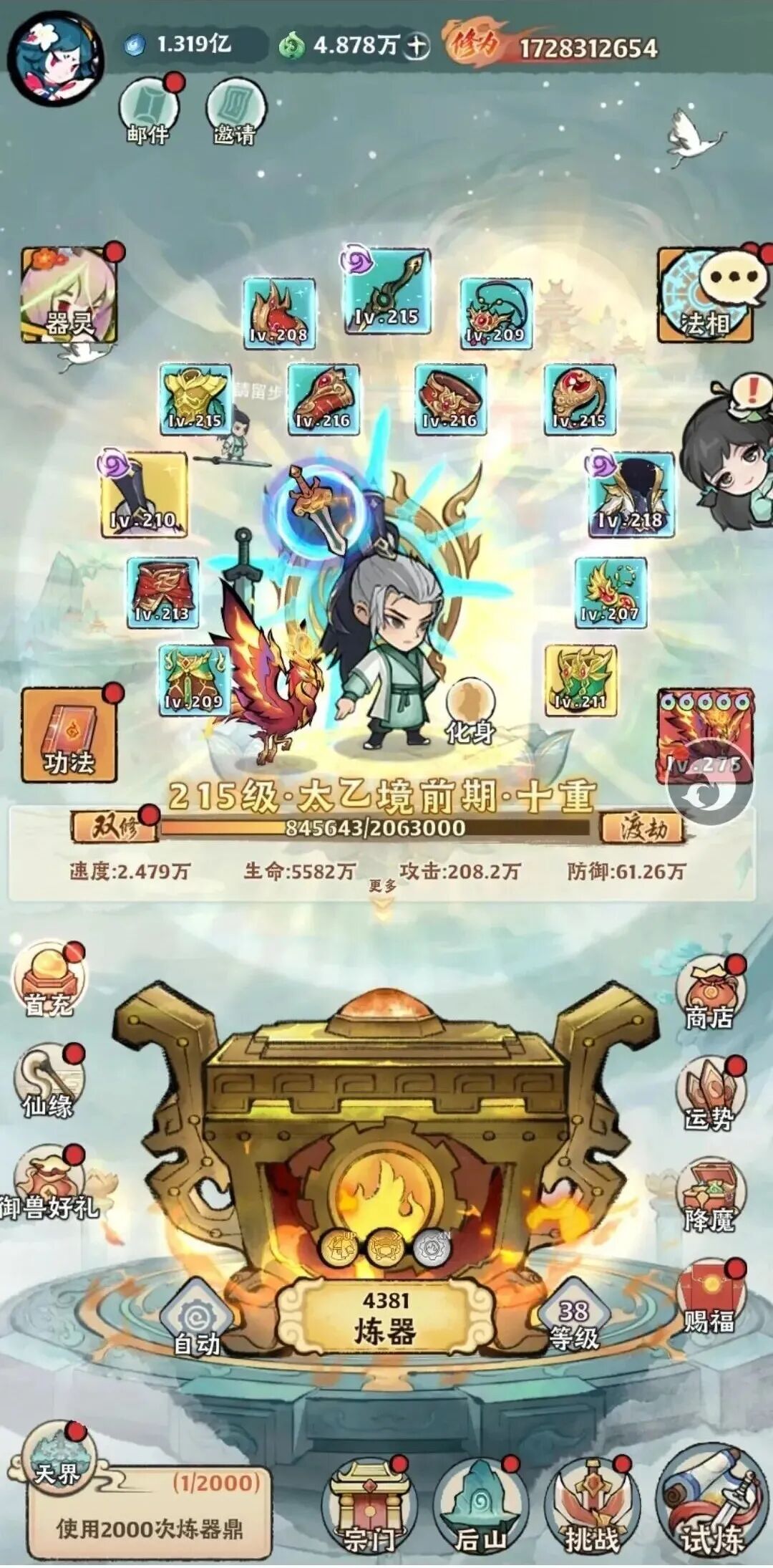 庆典活动:完成炼器 2000 次、境界达元婴、炼器鼎升 7 级、穿戴中上品装备;斩妖 15 次、后山采摘 80 次(速刷:点采摘 - 立即召回 - 再采摘)、抢夺他人后山 80 次、异兽 10 次、灵兽升级 50 - 100 次、抓捕 15 次灵兽。积分兑换优先引魂珠 > 御兽符 > 悟性果 > 清心茶 > 法相残篇 > 小仙鼠食物 > 口粮 > 箱子,前期开 2000 箱子囤货。