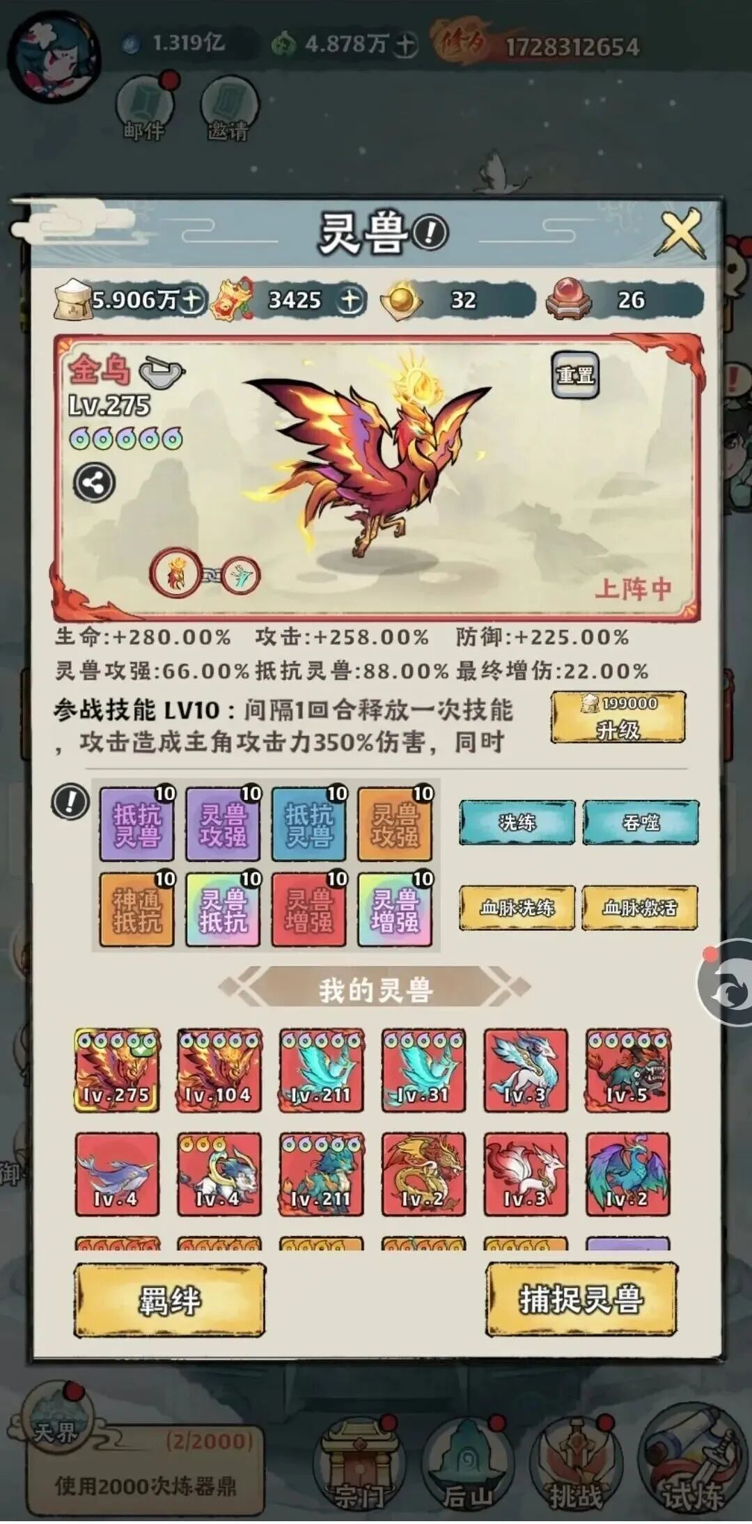 灵兽玩法:初始有灵兽口粮1180、御兽符211,优先抓铁角牛4(金)、土家蜥4(土)、云翅鸟 * 4(木),御兽符足可抓蓝、紫宠,避开水系。前期抓捕灵兽勿急着吞噬,为第三天神兽遗迹活动铺垫。