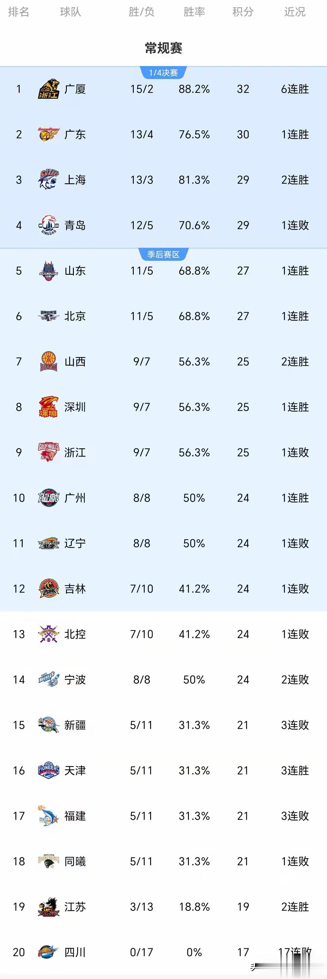 北京时间1月19日晚间,25/26赛季CBA常规赛上演精彩对决,今晚结束了4场焦点比赛!随着广厦男篮90-75大胜青岛男篮、广东男篮104-76狂胜四川男篮、山东男篮77-68逆转吉林男篮、广州男篮104-75力克北控男篮。CBA最新积分榜出炉!