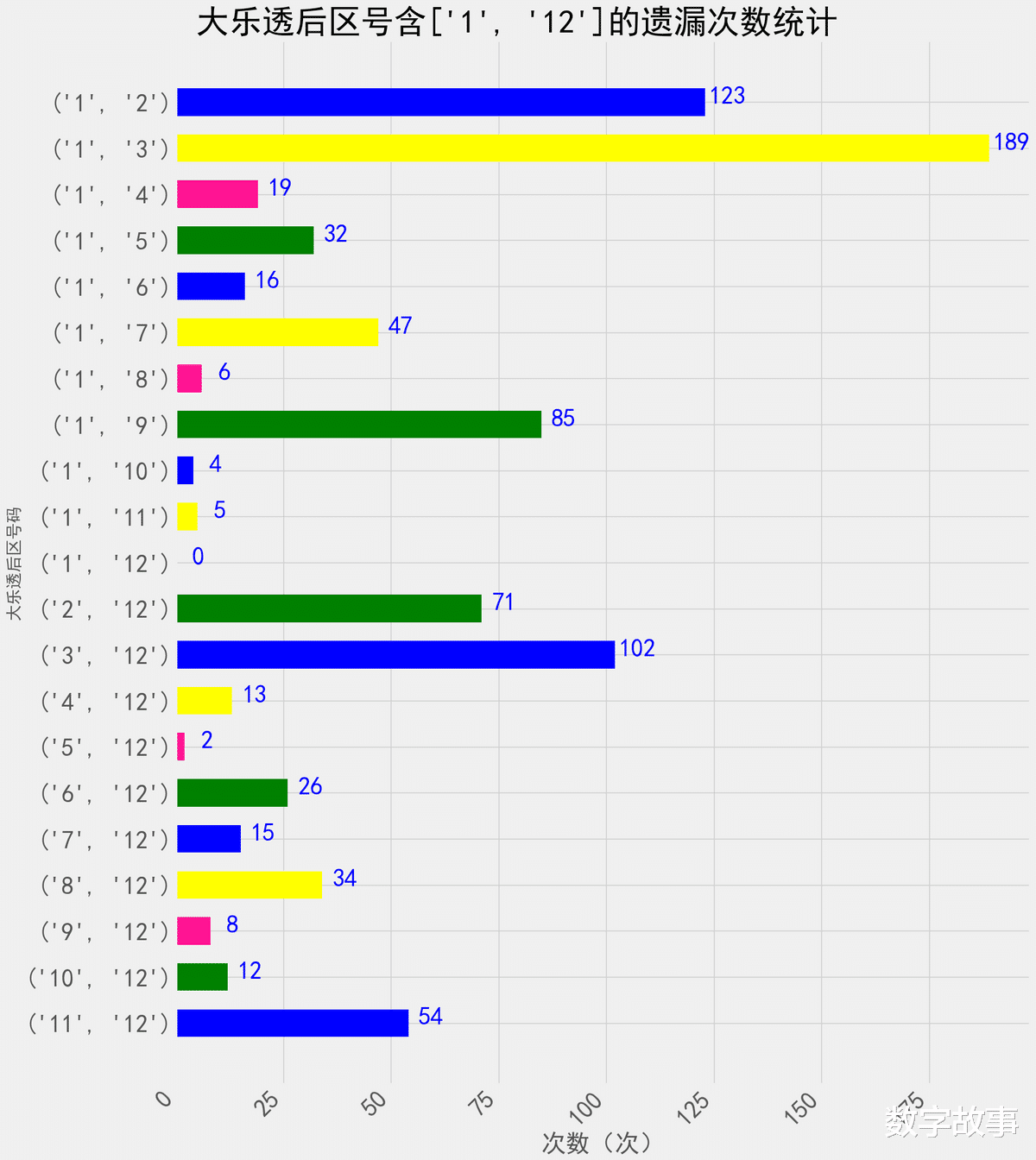 大乐透后区含1或12的双号遗漏次数统计大乐透后区组合1-12近150期出了2次,这次中断了13期遗漏。