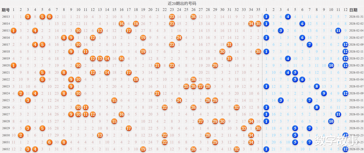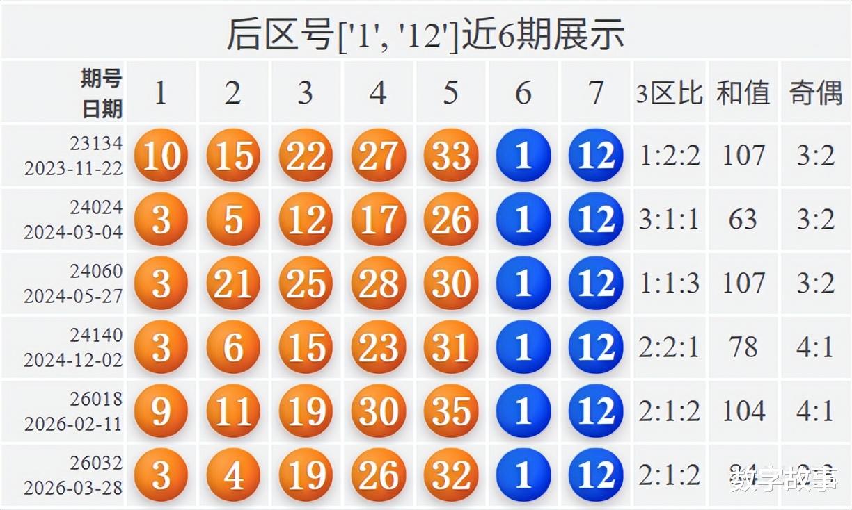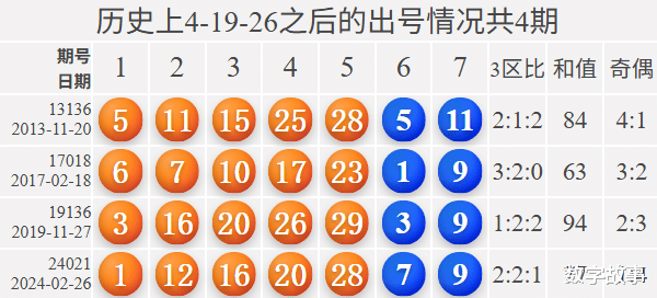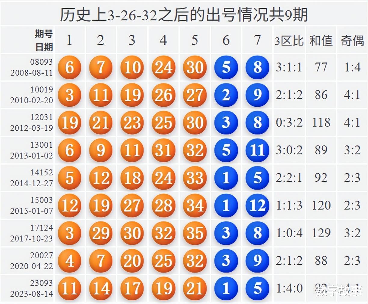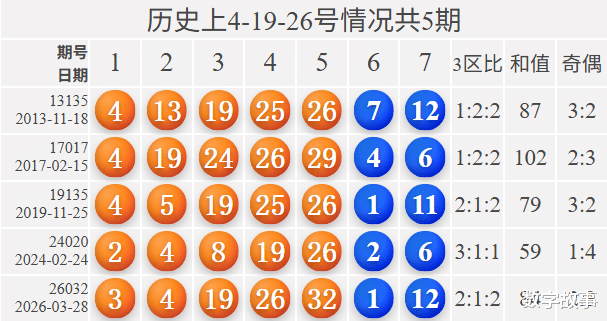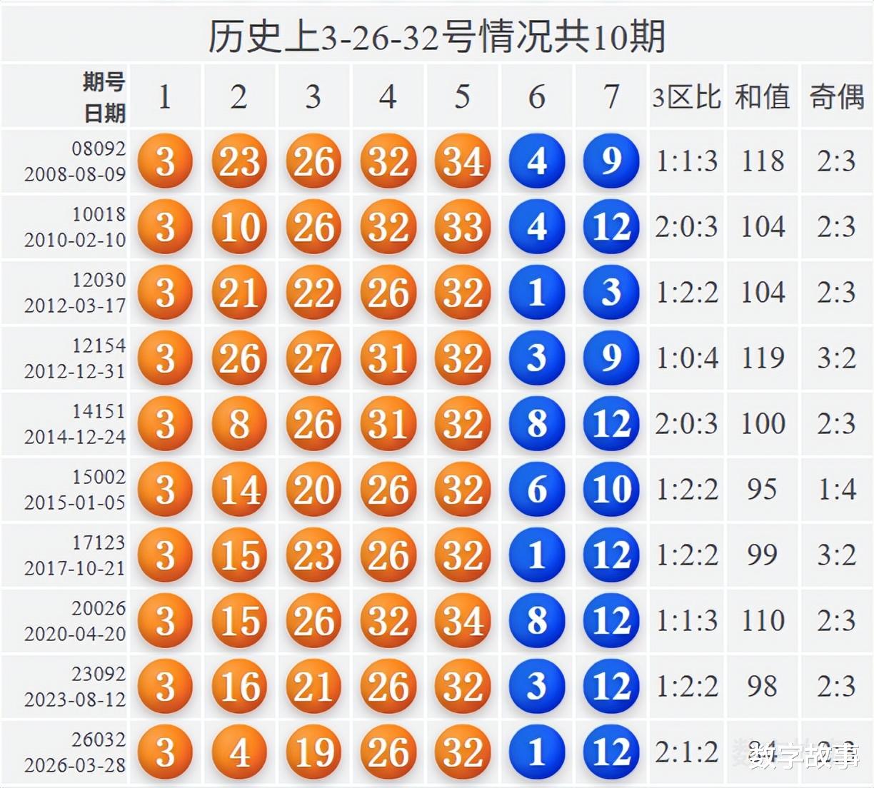 大乐透26032期前区号在过去是否出现过?大乐透26032期前区号: 3-4-19-26-32经查,历史上没有出现过与这一期5个前区号一样的,4个前区号一样的有1期,如下: