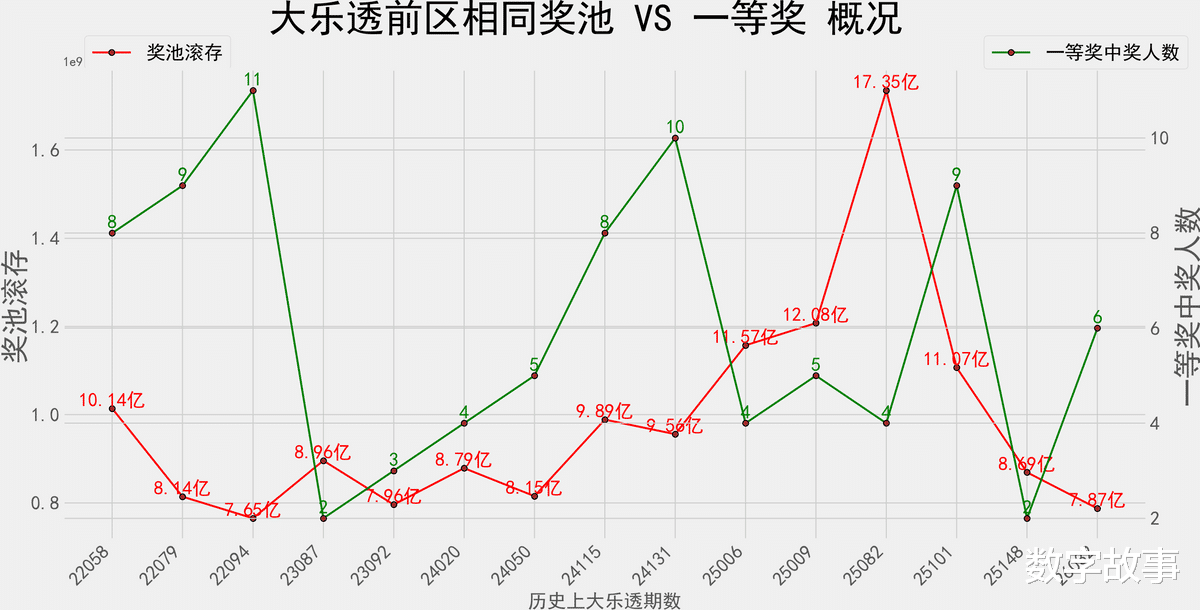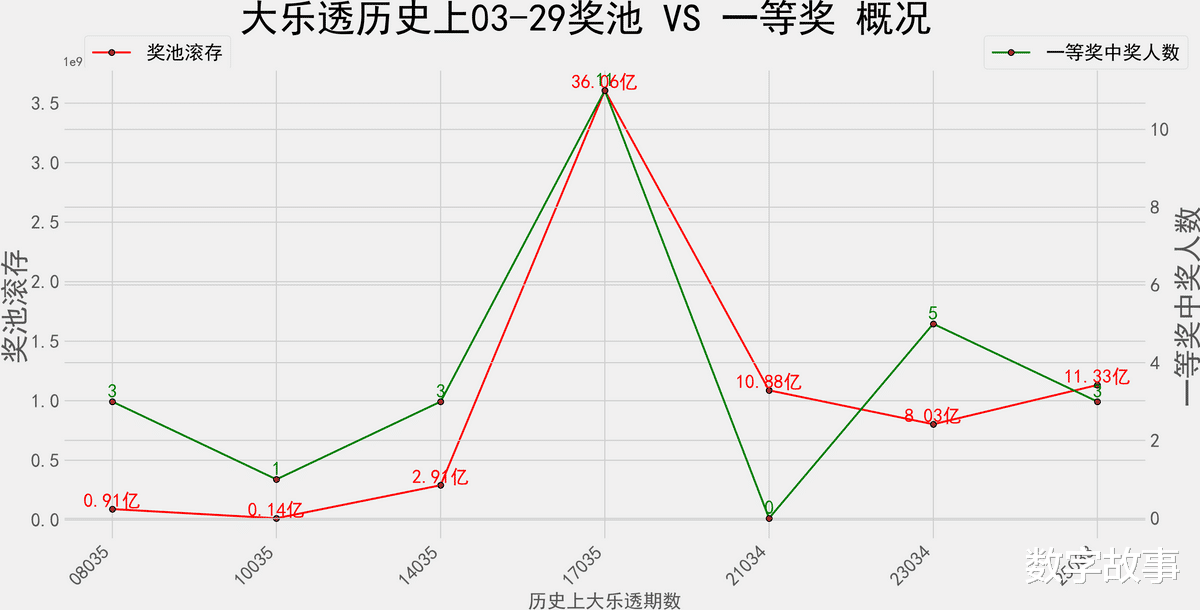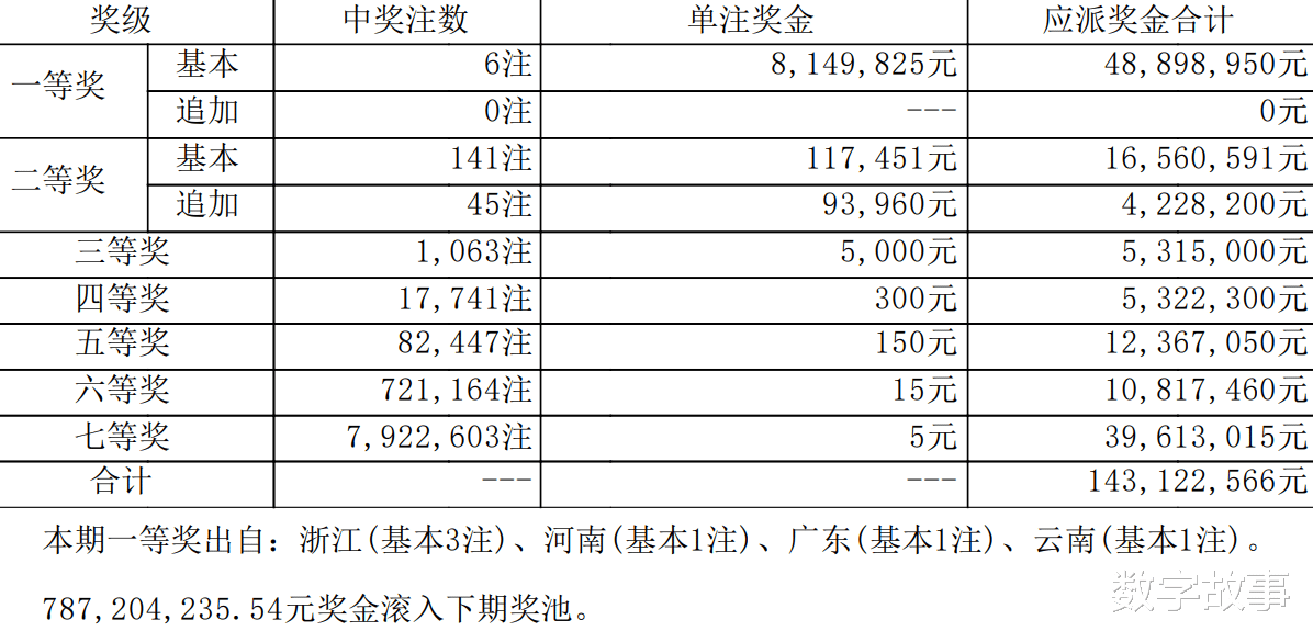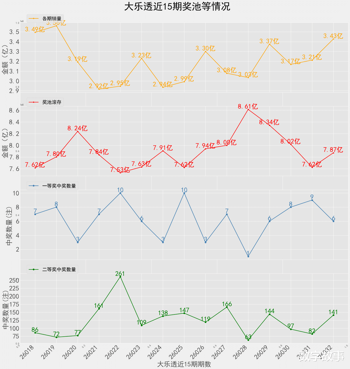 大乐透26032期一等奖:6注,追加: 0注二等奖:141注,追加: 45注。本期全国销售金额:3.427 亿 奖池滚存:7.872 亿.近15期奖池滚存, 中奖情况等信息: