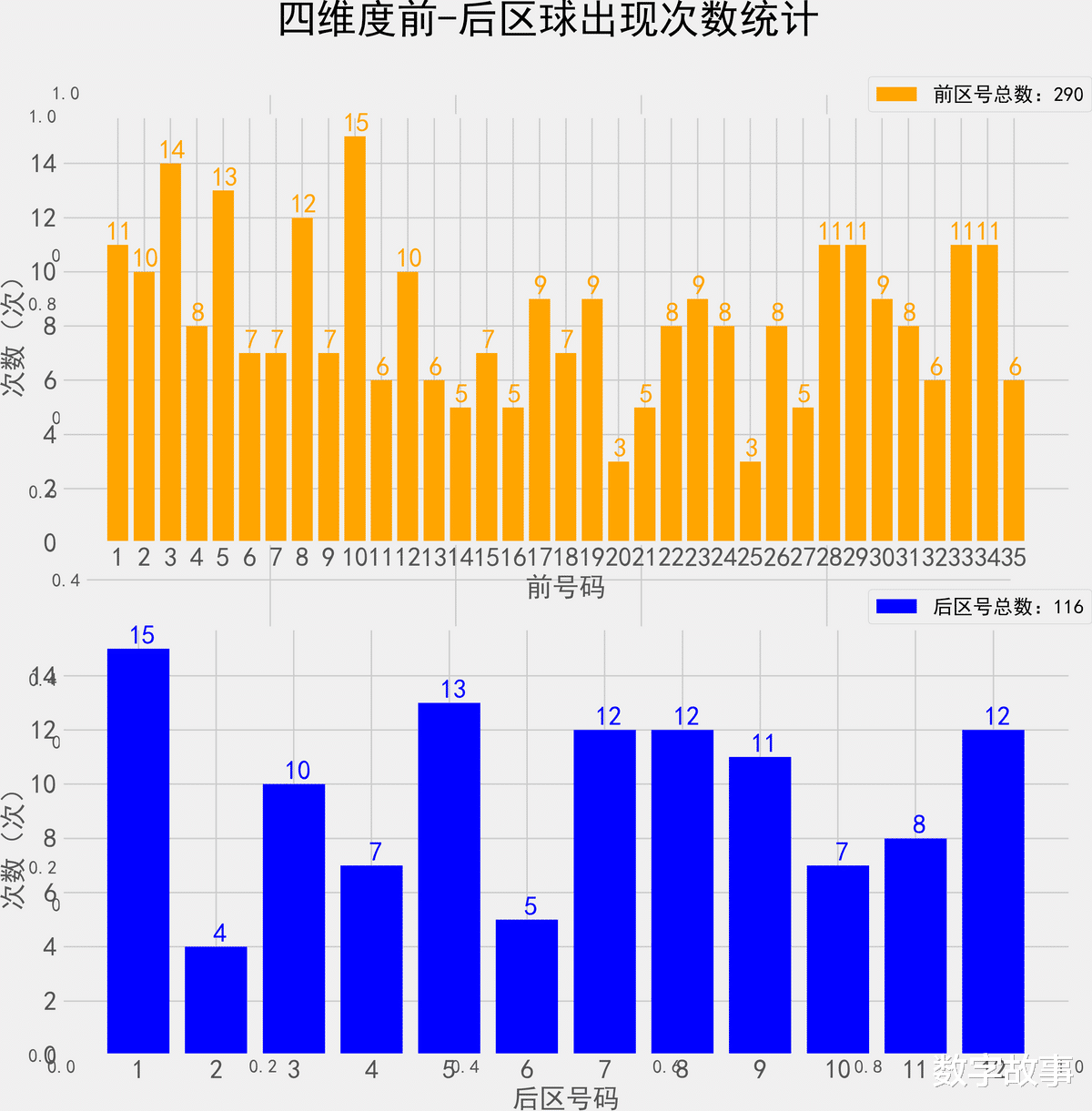 => 统计出现概率综合以上4个纬度的号码,共58期根据出现次数,分为热号,冷号,其他的为温号。统计样本数据: 290个前区号码 116个后区号码