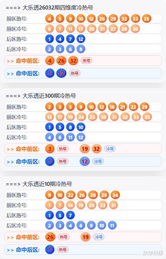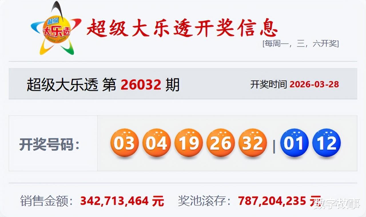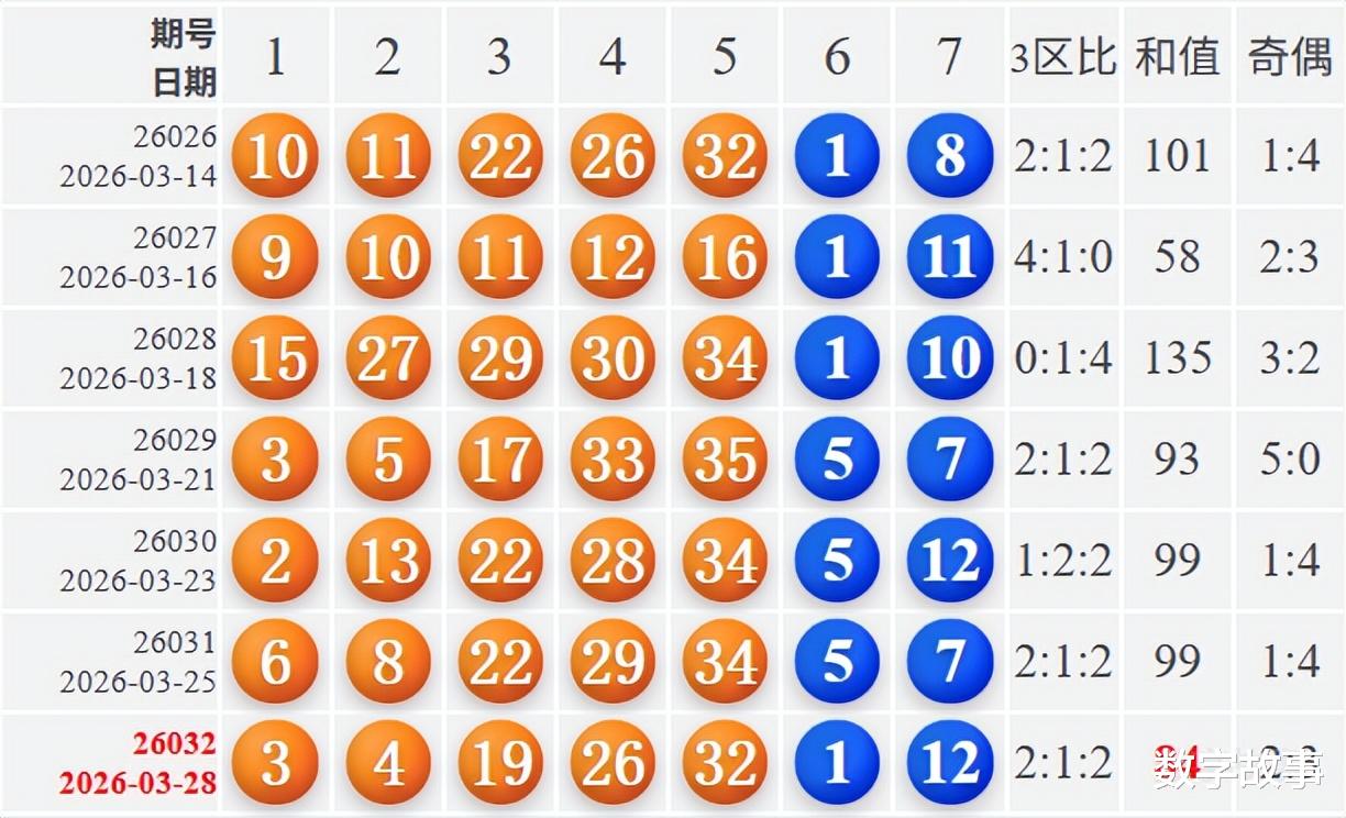 文末有大乐透前区号4-19-26, 3-26-32的历史统计。【体彩大乐透26032期开奖结果及统计】前区号组合历史上有1期四球相同,后区1-12中断13期遗漏;6注一等奖,奖池7.872亿。大乐透26032期开奖结果及中奖情况:出奖时间: 2026-03-28 星期六 前区号:3-4-19-26-32后区号:1-12后区隔期下落:12大乐透前区奇偶比:2:3 前区和值:84前区跨度:29 三区比:2:1:2连号: 3-4