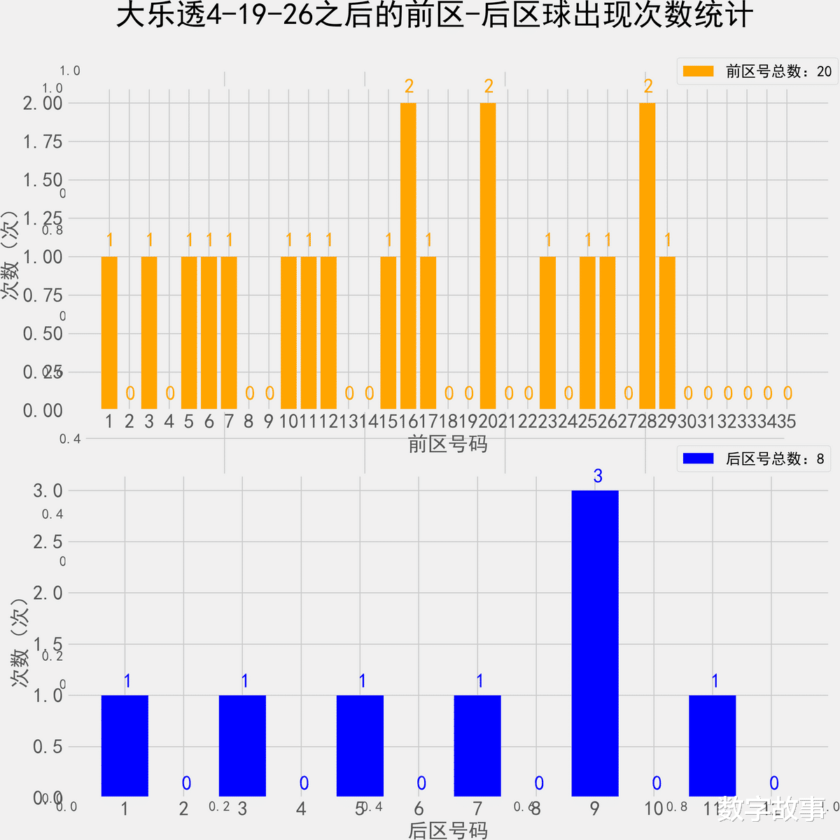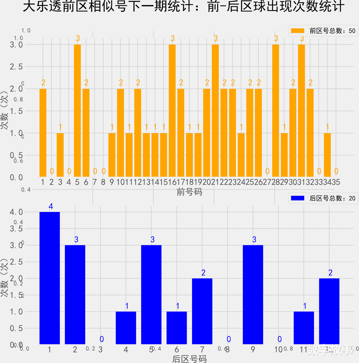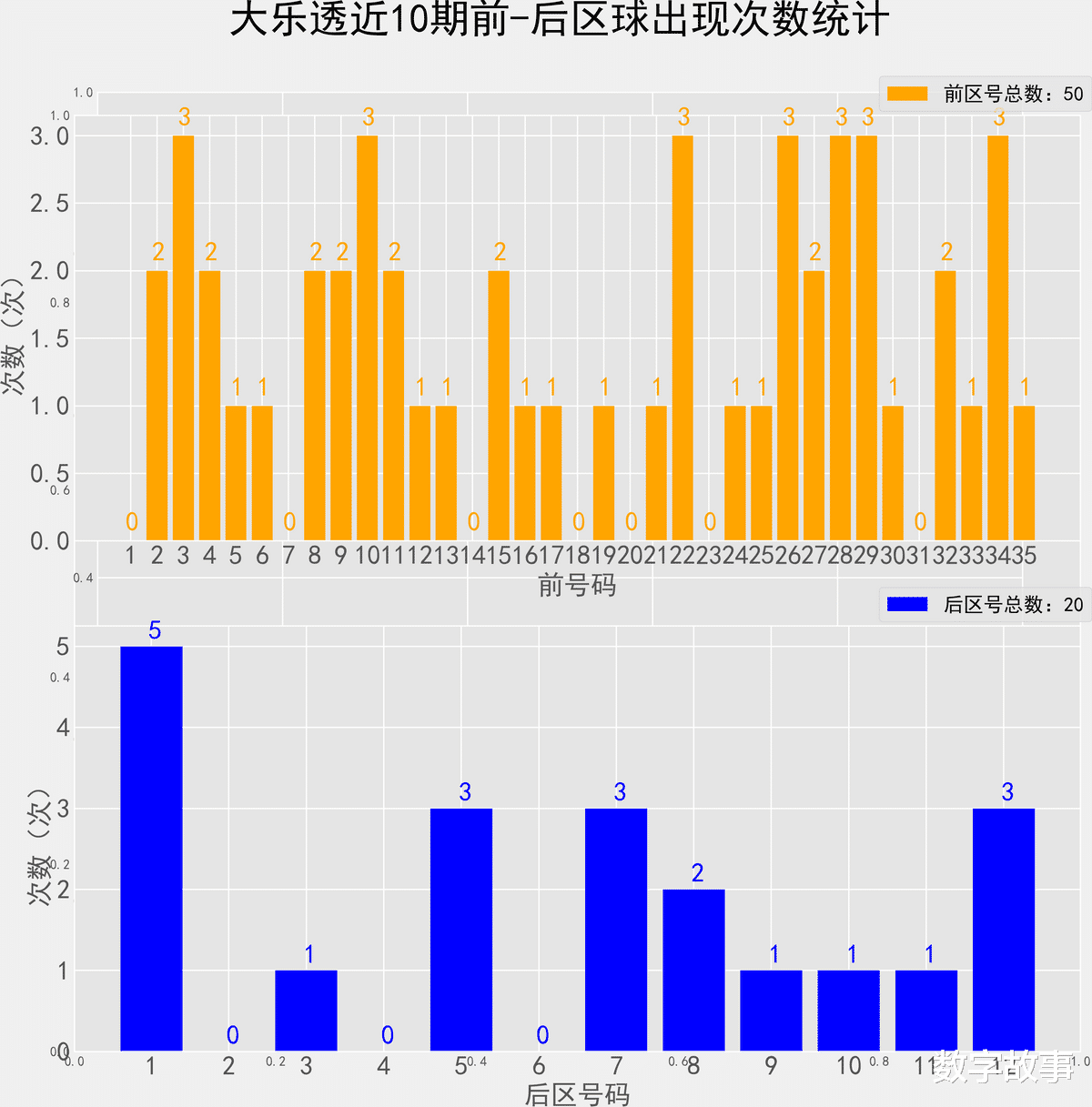 大乐透近10期前后区号统计情况统计样本数据: 50个前区号码 20个后区号码