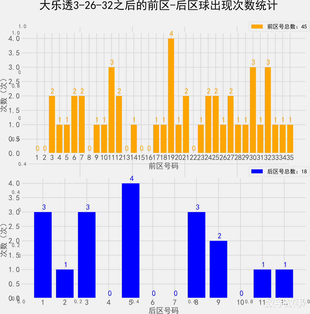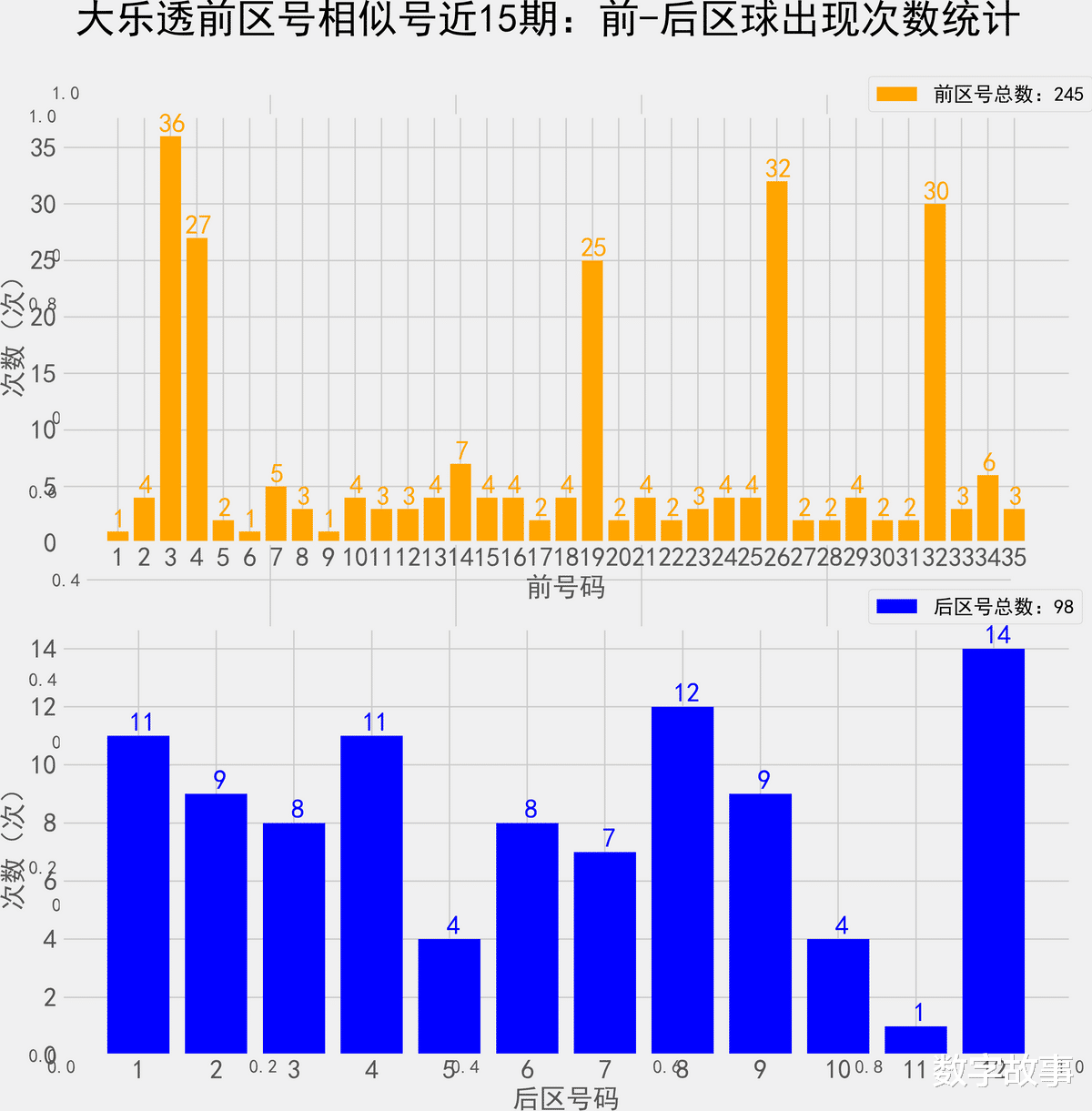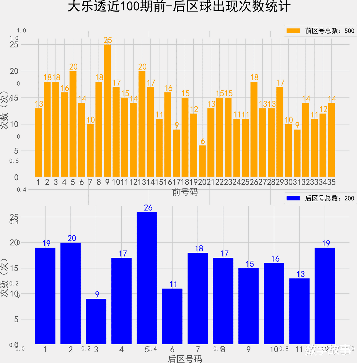 大乐透近100期前后区号统计情况统计样本数据: 500个前区号码 200个后区号码