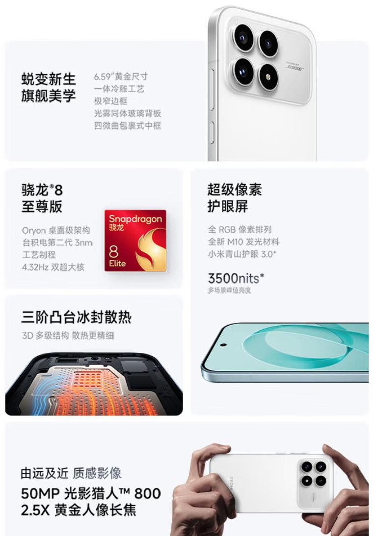 核心优势:骁龙 8 至尊版处理器 + 7100mAh 金沙江电池,安兔兔跑分 180 万 +,《王者荣耀》120 帧满帧运行,重度使用 1.2 天无压力。6.59 英寸 1.5K 直屏 + 120Hz 高刷 + 3840Hz 调光,兼顾流畅与护眼,铝合金中框质感远超同价位塑料机型。