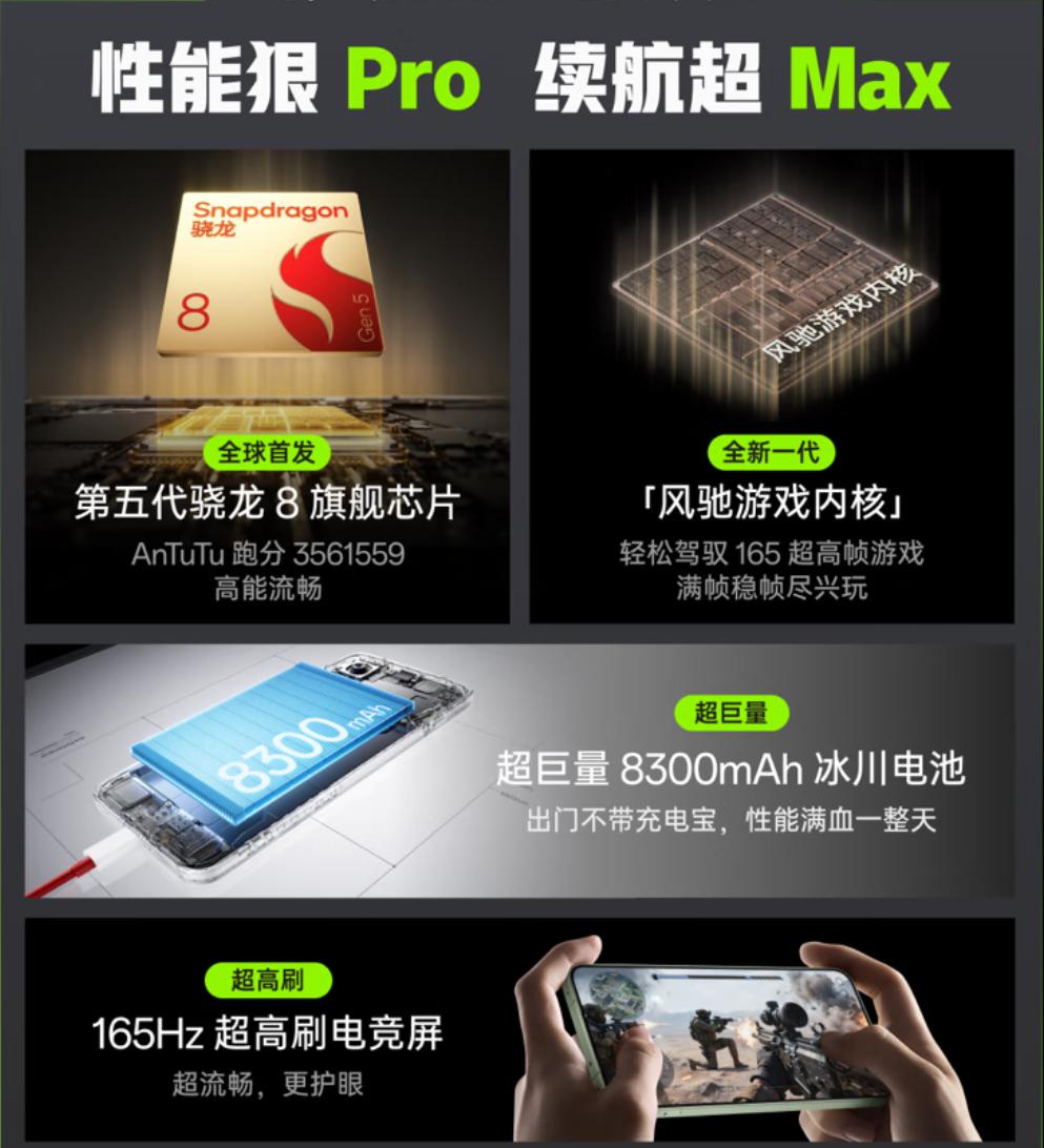 核心优势:8300mAh 超大电池 + 100W 快充,实测两天一充,30 分钟充满,彻底告别电量焦虑。骁龙 8 Gen5 处理器能效比出色,日常使用与大型游戏皆稳,6.83 英寸 165Hz 高刷屏,刷视频、玩游戏流畅度拉满。
