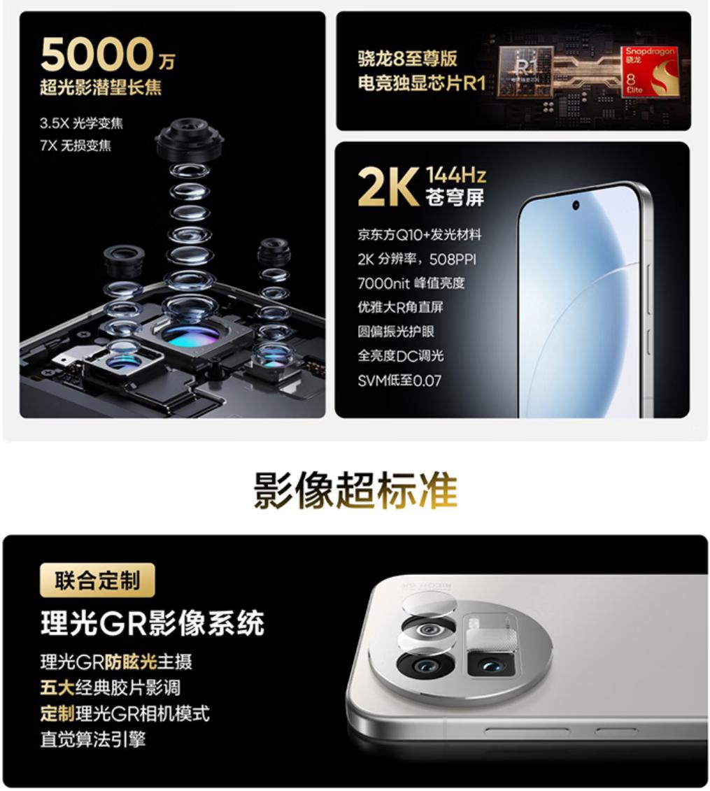 核心优势:2K 144Hz 苍穹屏(2000nit 峰值亮度),强光下可视性极佳。5000 万理光 GR 防眩光主摄 + 5000 万潜望长焦,同价位唯一潜望式长焦配置,远景拍摄与人像虚化效果媲美旗舰机。