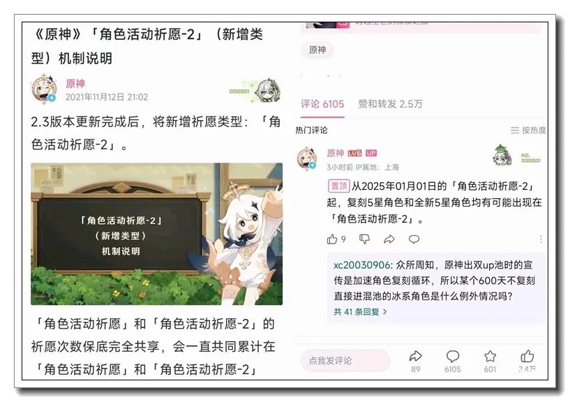 让人略显无语的是,他们是悄悄的进行,不想过于引人注目,所以没有选择新发公告,而且在2021年的公告留言区补发了这样一行话:“从2025年1月1日的角色活动祈愿-2(复刻池子)起,复刻5星和全新5星角色均有可能出现在【角色活动祈愿-2】里。”