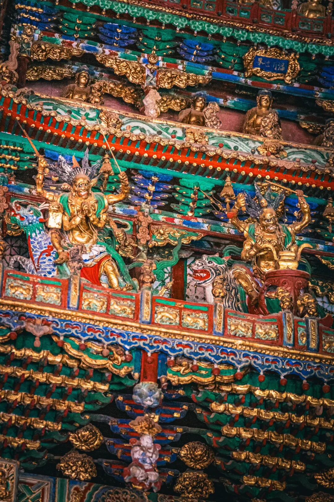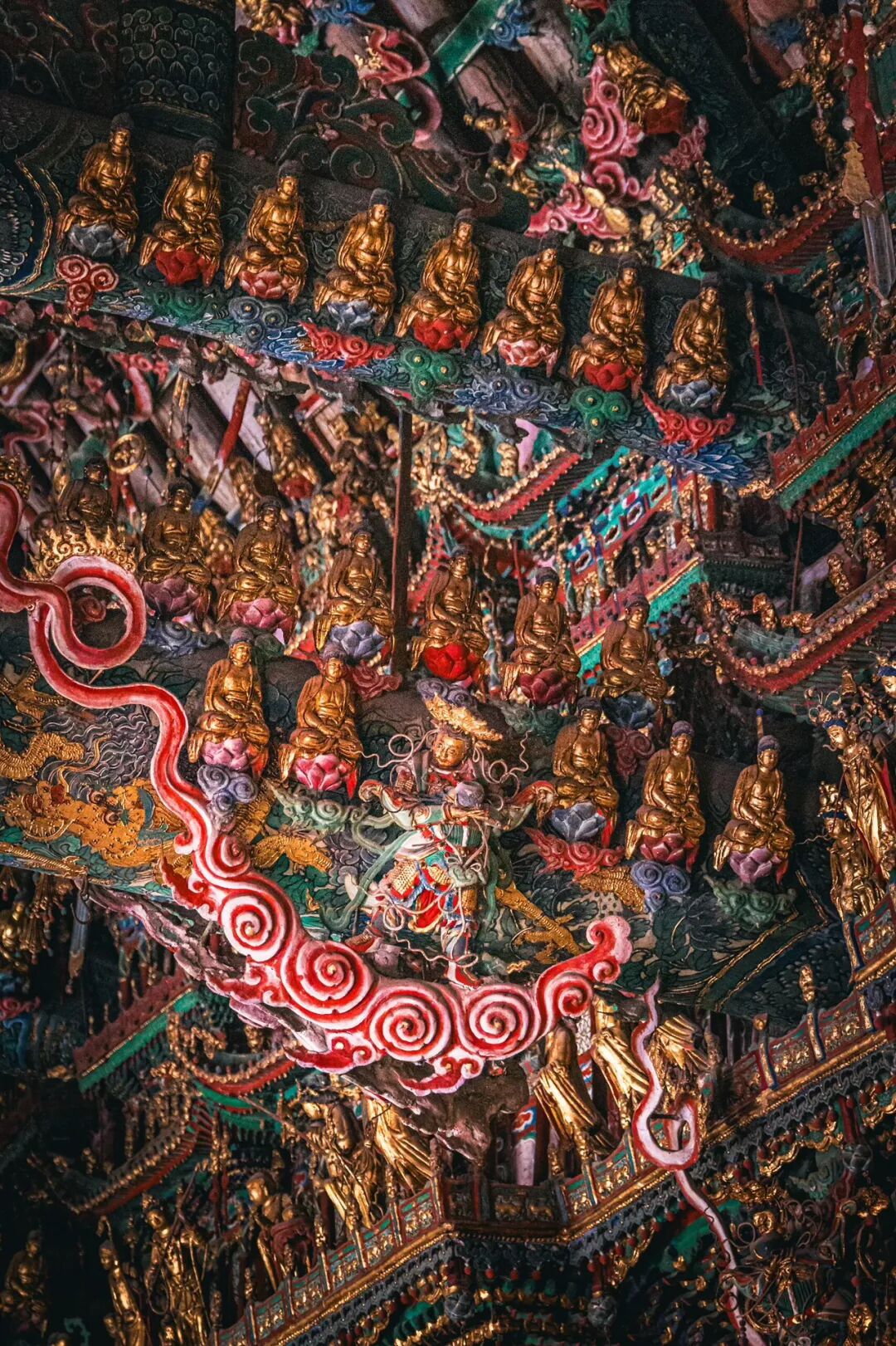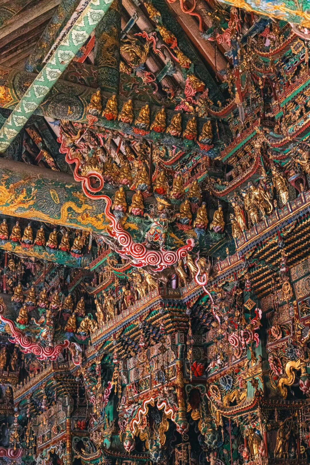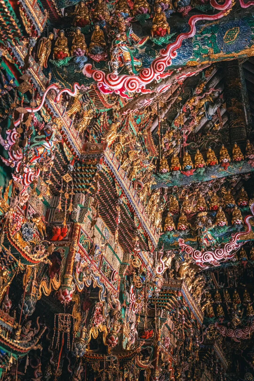 抬头望去的第一秒,视线就被殿顶的“天宫楼阁”钉住了。没有一寸留白的梁枋上,近两千尊彩塑密密麻麻地挤在一起,却丝毫不显杂乱,反倒像一场精心编排的神佛盛会。最显眼的是正中的诸佛,身披繁复的袈裟,衣褶层层叠叠如流水般垂落,每一道纹路都刻得清晰利落,连袈裟边缘的缠枝莲纹都细致到能看清花瓣的脉络。佛像的面容温润,眉眼间带着慈悲的笑意,头顶的宝冠缀着细碎的金箔,在微光里闪着柔和的光,让人忍不住想踮起脚尖,看看那宝冠里是不是真的藏着传说中的摩尼宝珠。