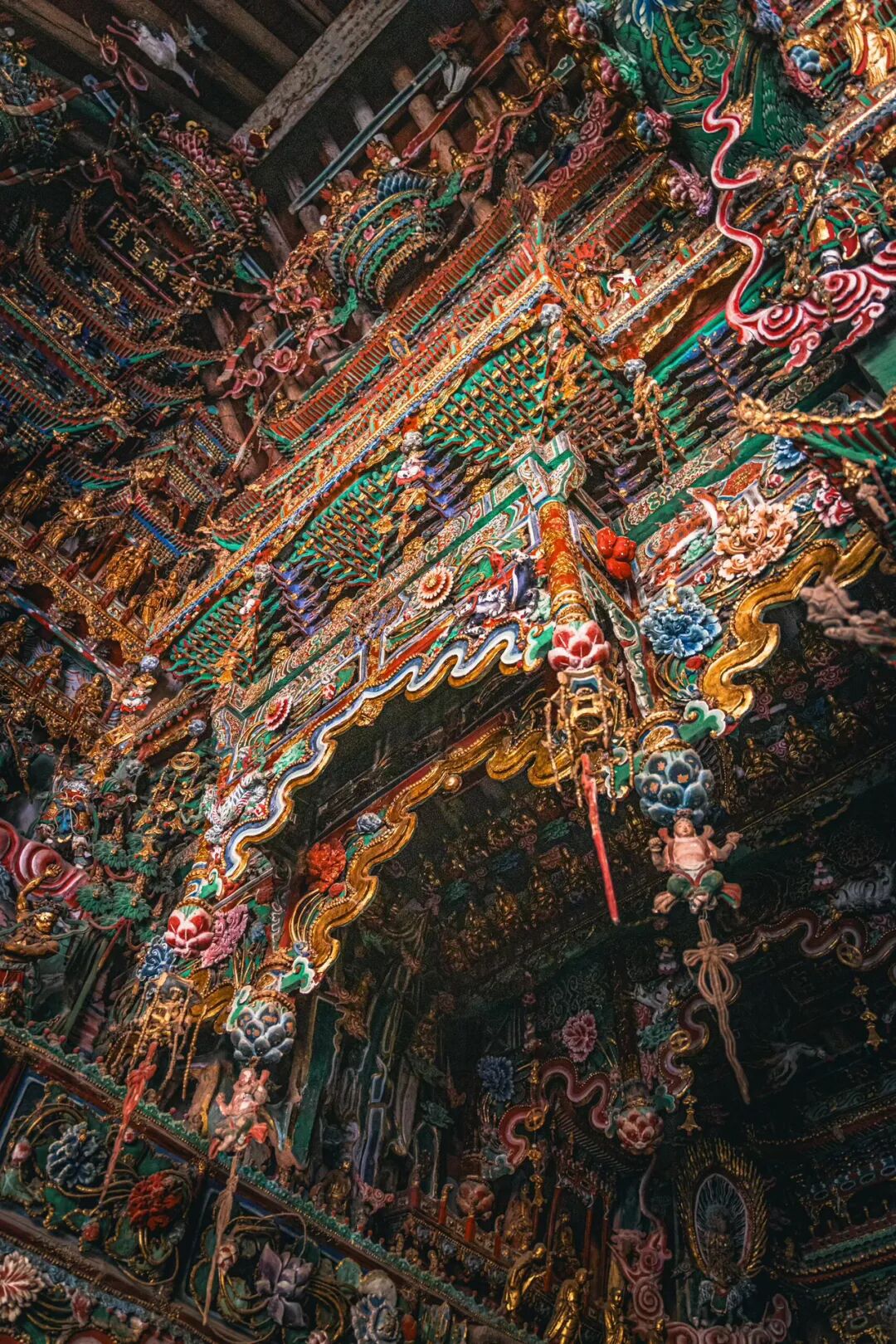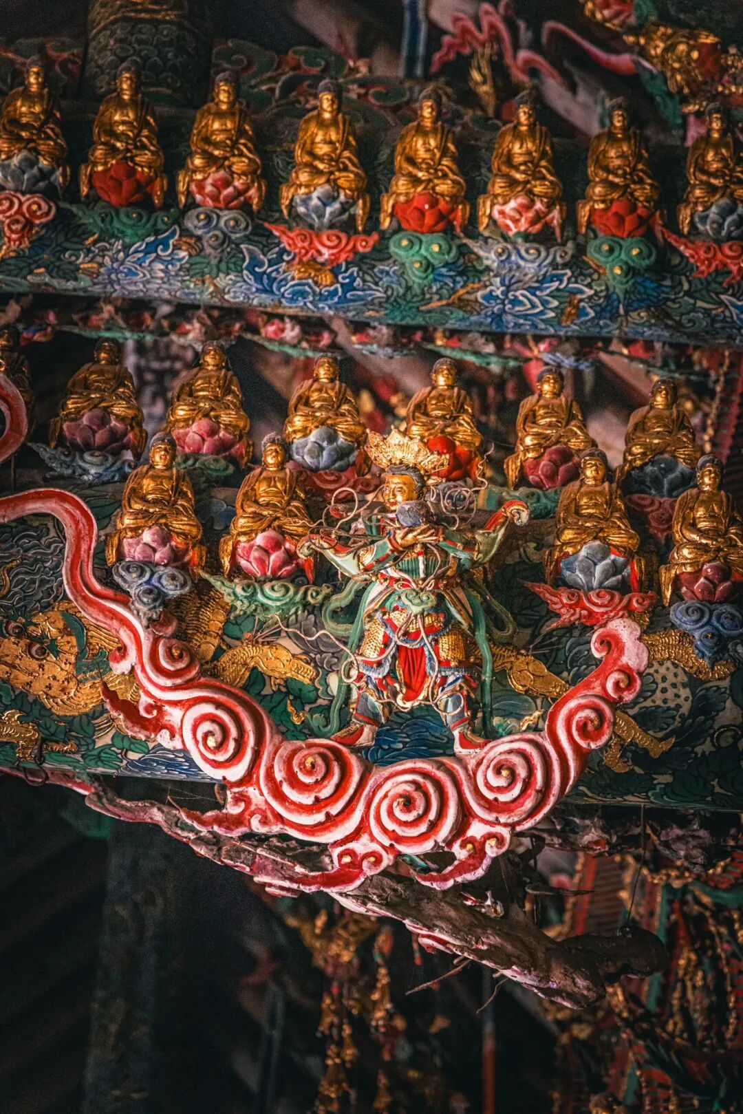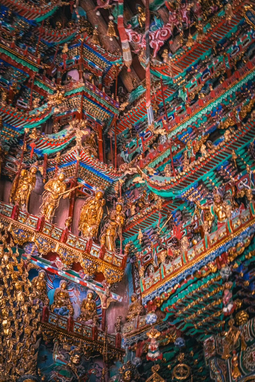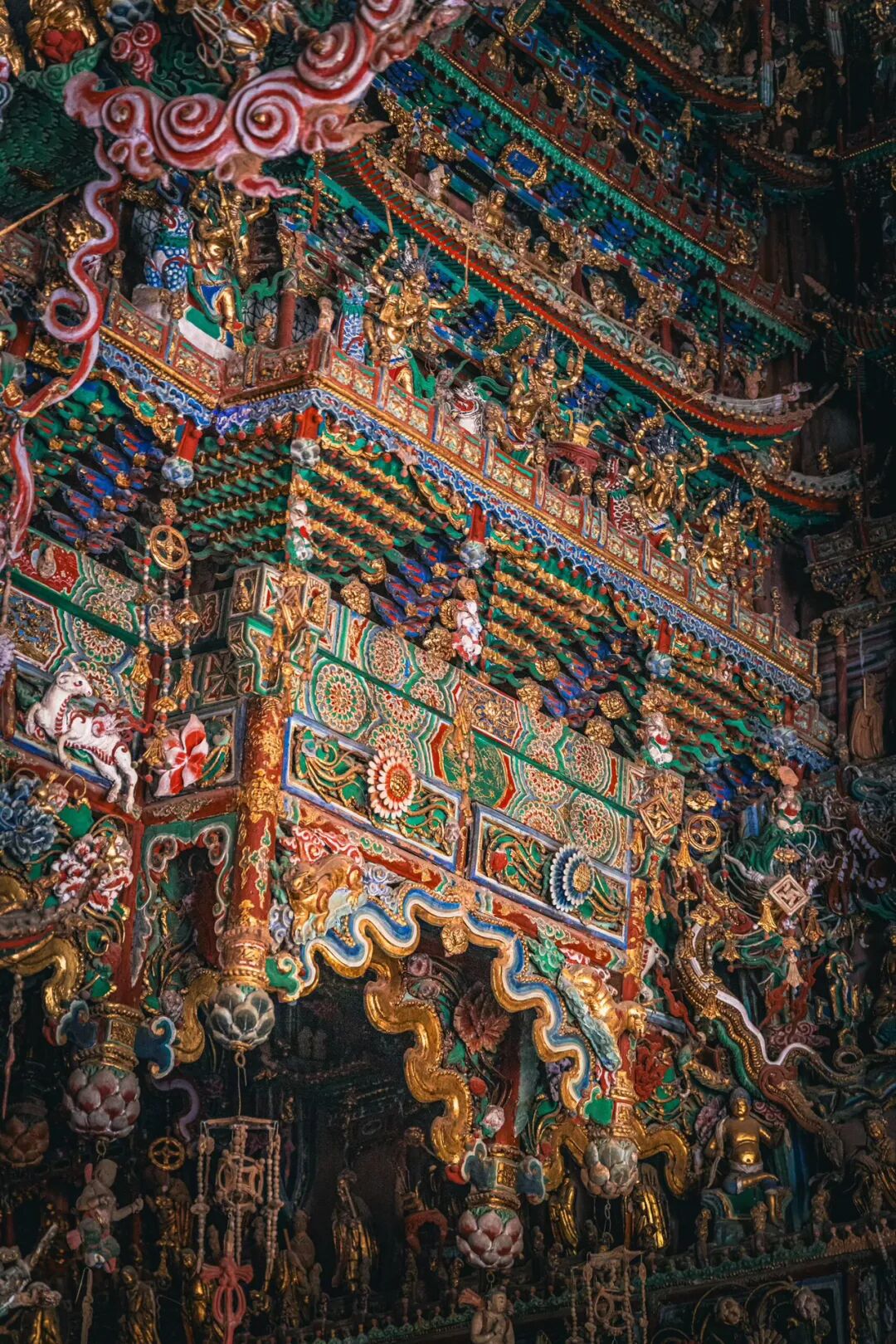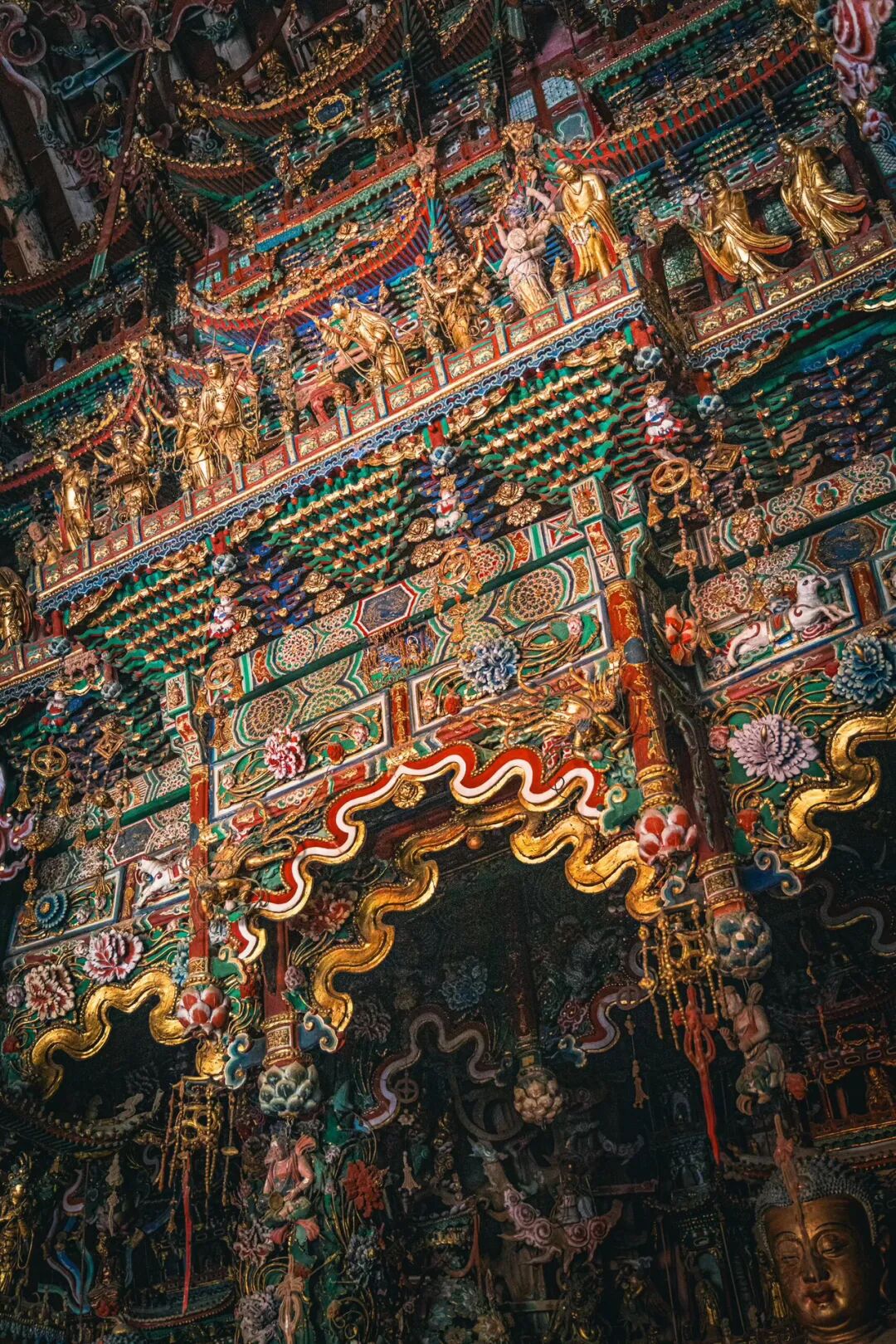 抬头望去的第一秒,视线就被殿顶的“天宫楼阁”钉住了。没有一寸留白的梁枋上,近两千尊彩塑密密麻麻地挤在一起,却丝毫不显杂乱,反倒像一场精心编排的神佛盛会。最显眼的是正中的诸佛,身披繁复的袈裟,衣褶层层叠叠如流水般垂落,每一道纹路都刻得清晰利落,连袈裟边缘的缠枝莲纹都细致到能看清花瓣的脉络。佛像的面容温润,眉眼间带着慈悲的笑意,头顶的宝冠缀着细碎的金箔,在微光里闪着柔和的光,让人忍不住想踮起脚尖,看看那宝冠里是不是真的藏着传说中的摩尼宝珠。