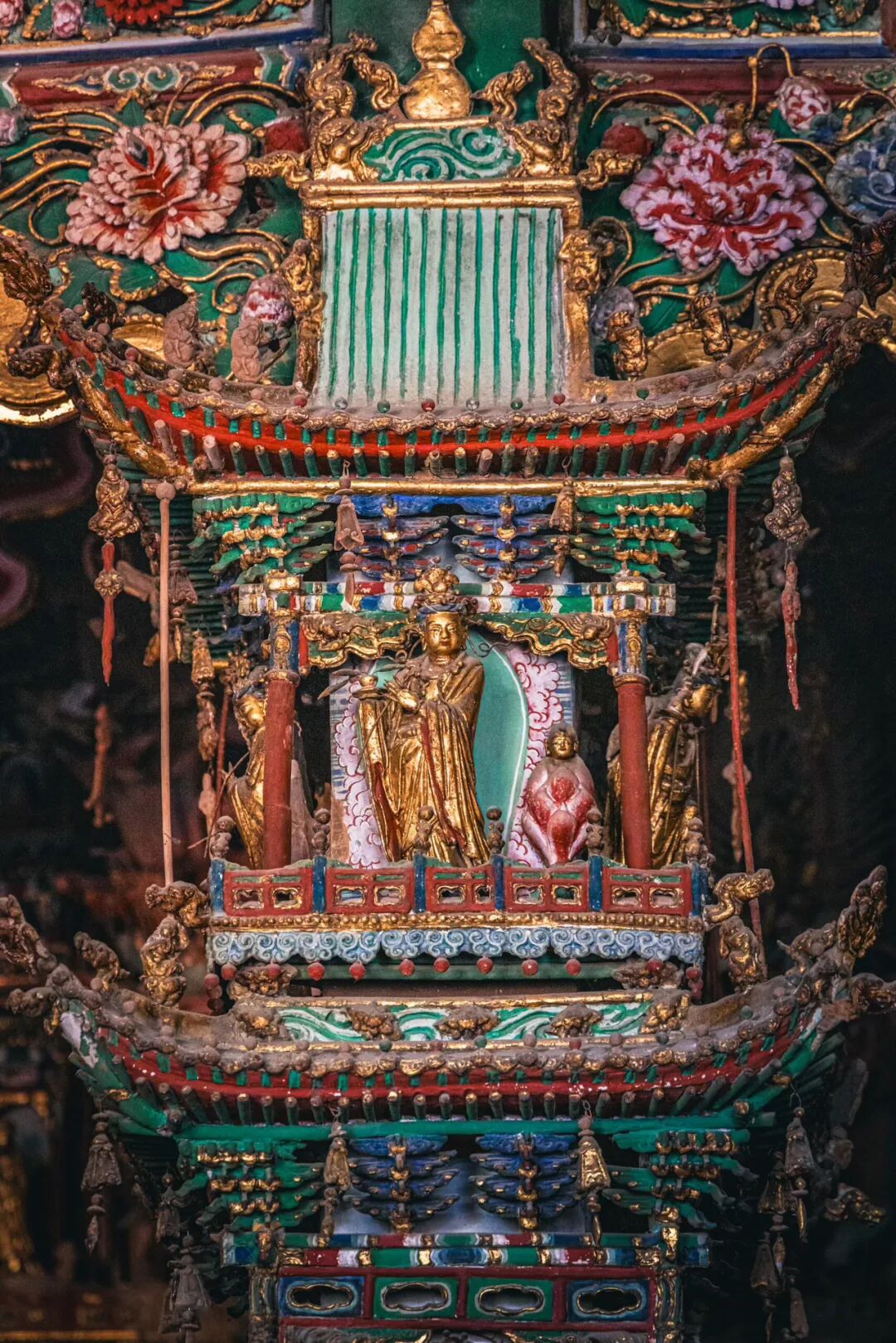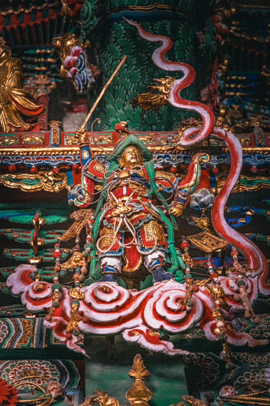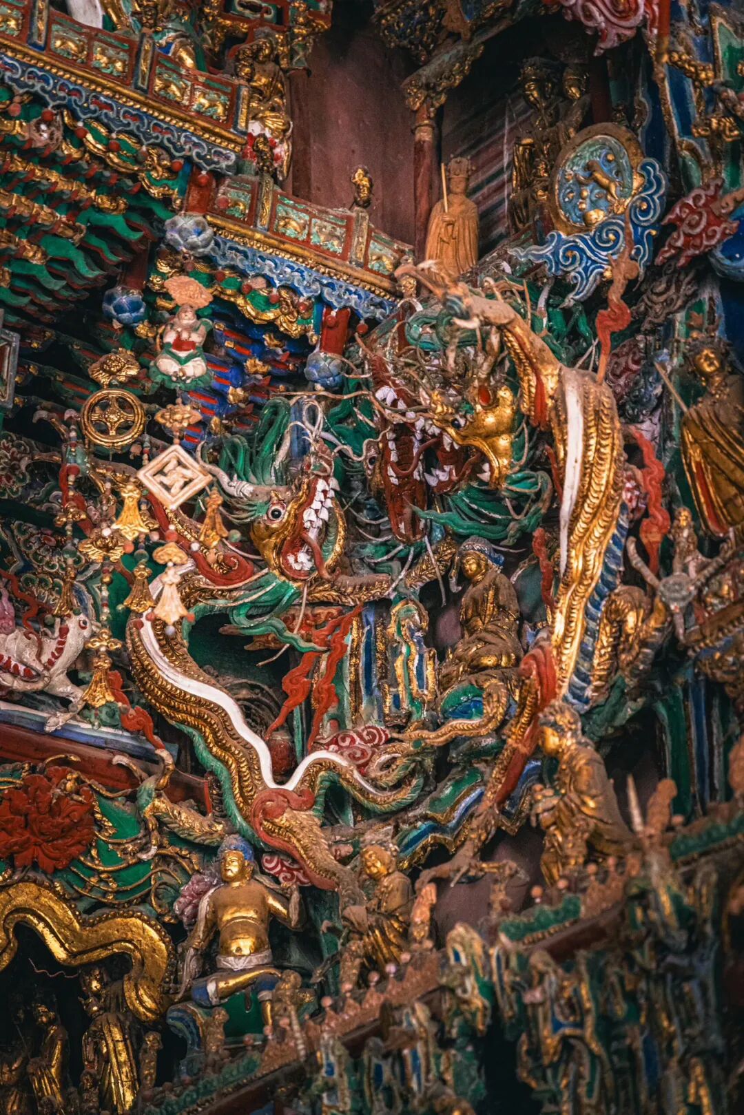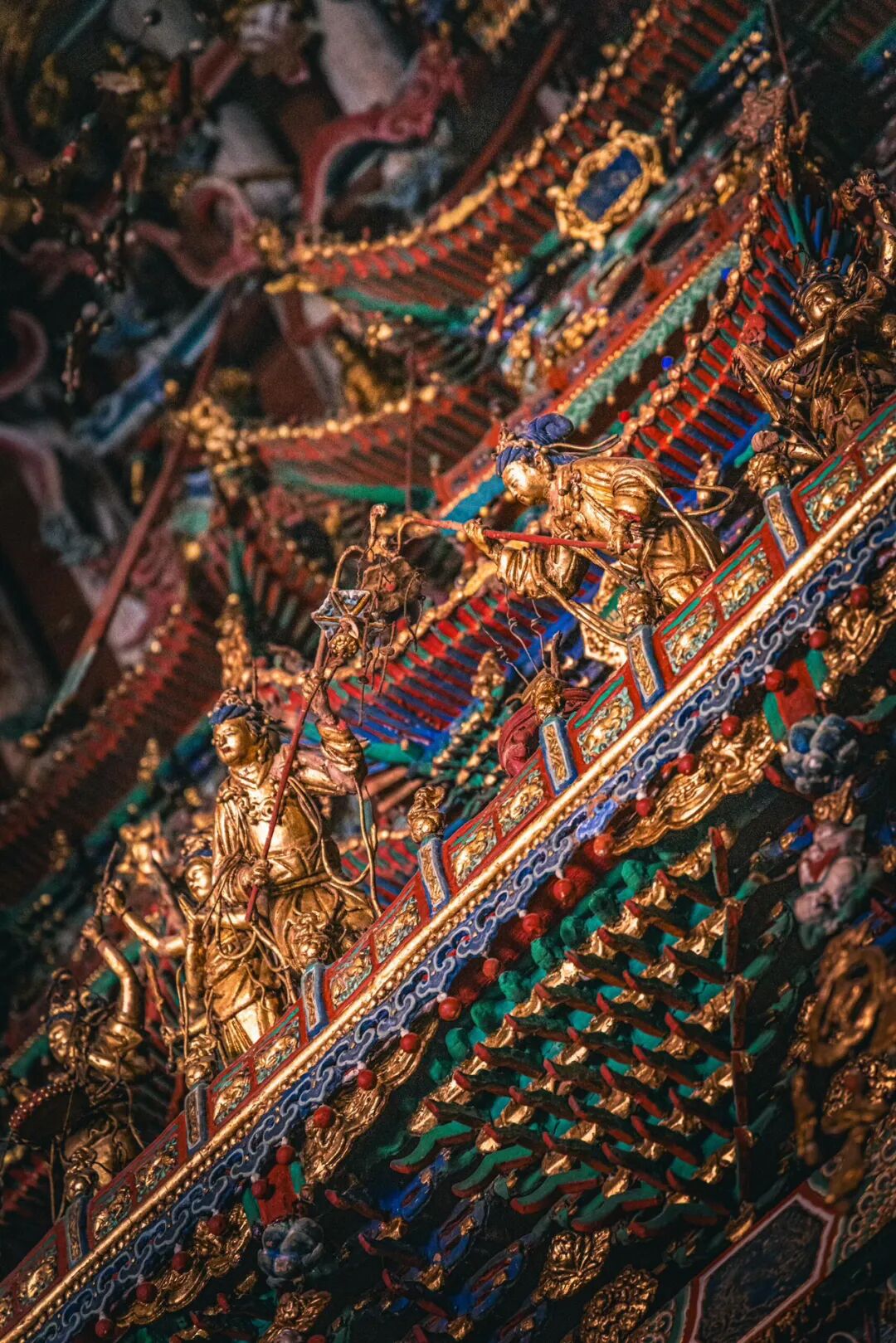 抬头望去的第一秒,视线就被殿顶的“天宫楼阁”钉住了。没有一寸留白的梁枋上,近两千尊彩塑密密麻麻地挤在一起,却丝毫不显杂乱,反倒像一场精心编排的神佛盛会。最显眼的是正中的诸佛,身披繁复的袈裟,衣褶层层叠叠如流水般垂落,每一道纹路都刻得清晰利落,连袈裟边缘的缠枝莲纹都细致到能看清花瓣的脉络。佛像的面容温润,眉眼间带着慈悲的笑意,头顶的宝冠缀着细碎的金箔,在微光里闪着柔和的光,让人忍不住想踮起脚尖,看看那宝冠里是不是真的藏着传说中的摩尼宝珠。