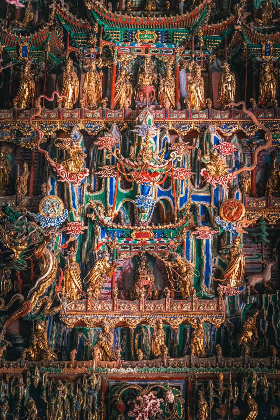 推开小西天大雄宝殿那扇吱呀作响的木门时,秋阳正斜斜地从窗棂里溜进来,在青砖地上织出细碎的光纹。我原以为不过是寻常古寺的殿宇,抬脚迈进去的瞬间,呼吸却突然卡在了喉咙里——不是因为殿内的阴凉,而是被眼前铺天盖地的绚烂撞得发懵。这哪里是寺庙的大殿,分明是把整座明代天宫从云端摘了下来,稳稳当当地嵌在了这方寸空间里,连风穿过殿宇的声音,都像是从神佛的衣袂间漏下来的梵音。